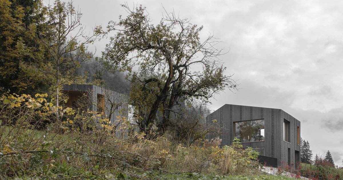 The design language chosen by Naemas Architekten beautifully balances contemporary aesthetics with nods to the farmhouse's historical context. The decision to incorporate an asymmetrical gable roof and a façade pattern reminiscent of the original structure pays homage to the past. In the first building, the architects faithfully recreated the historical context using materials such as larch wood flooring, linen textiles, and Silberquarzit stone sourced from a nearby mine. Even the fall protection on the stairs draws inspiration from the patterned façade of the old farmhouse.