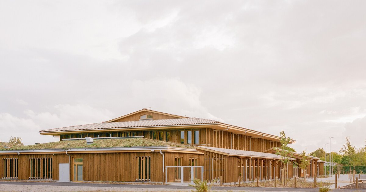 Nature-immersed elementary school in Audenge with outdoor classrooms, biodiverse courtyards, and bio-based materials, fostering wellbeing, ecological learning, and sustainable education.