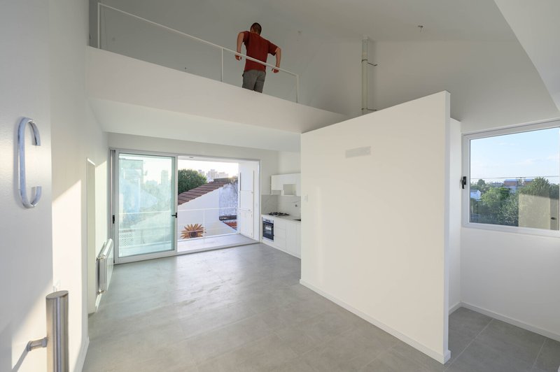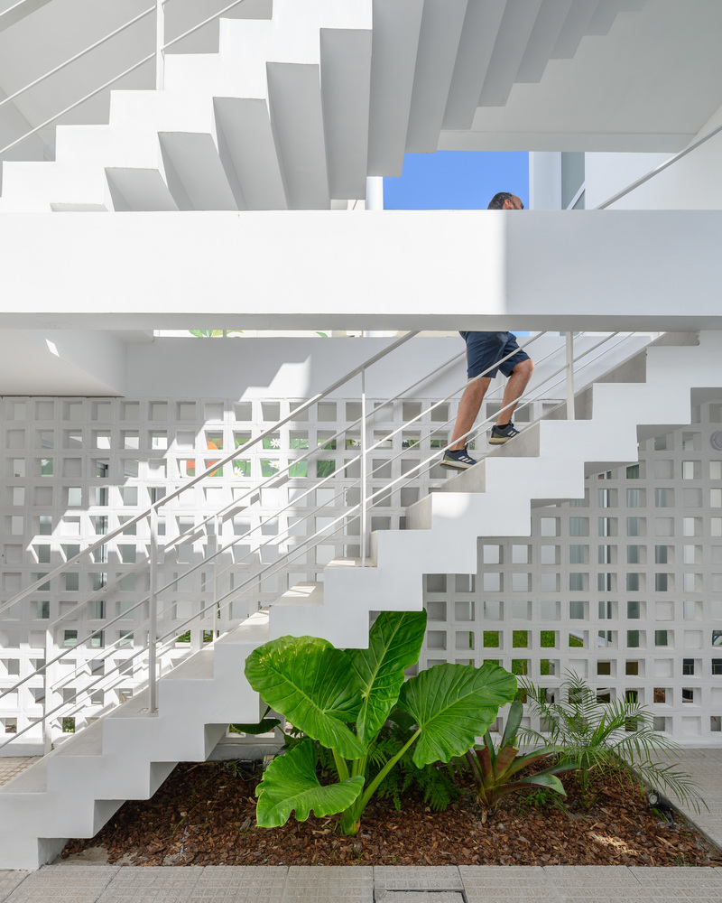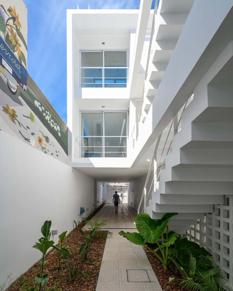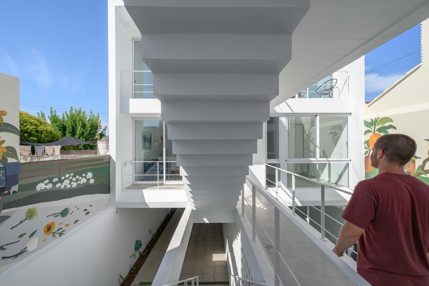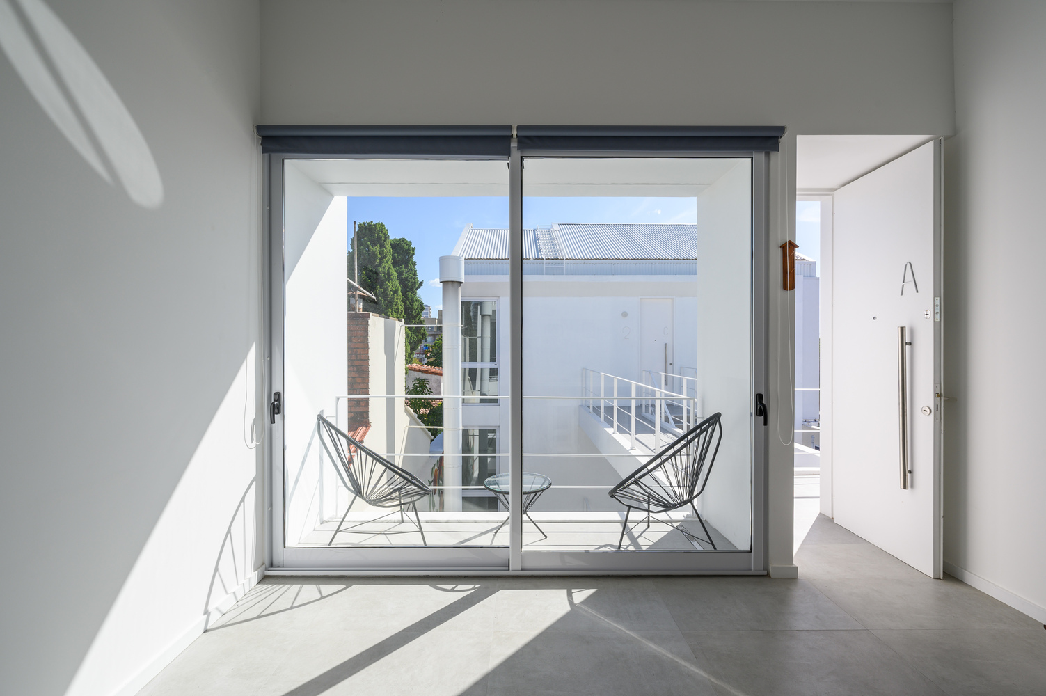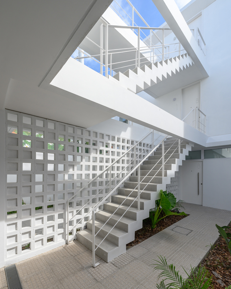 The building is composed of two main volumes that span the entire width of the site. These are connected by a vertical, permeable circulation core, which not only links the units but also generates private patios. This design strategy transforms each unit into a “house within the building,” enhancing residents’ sense of ownership and identity.