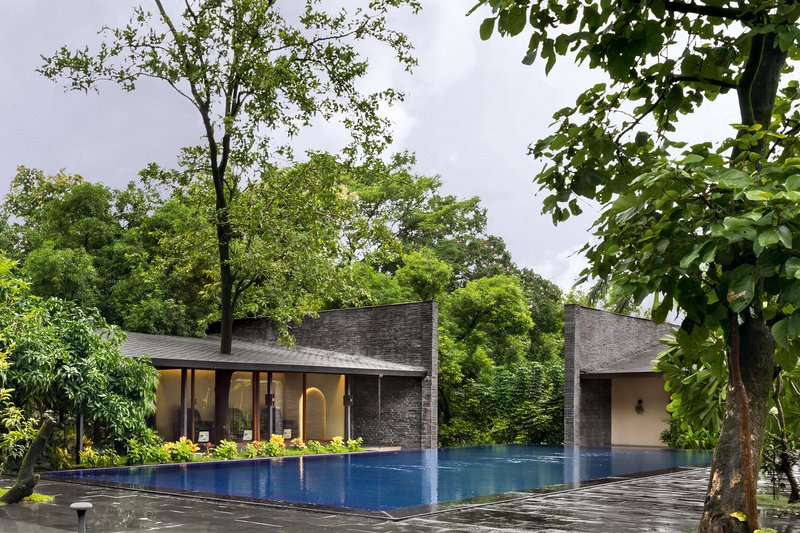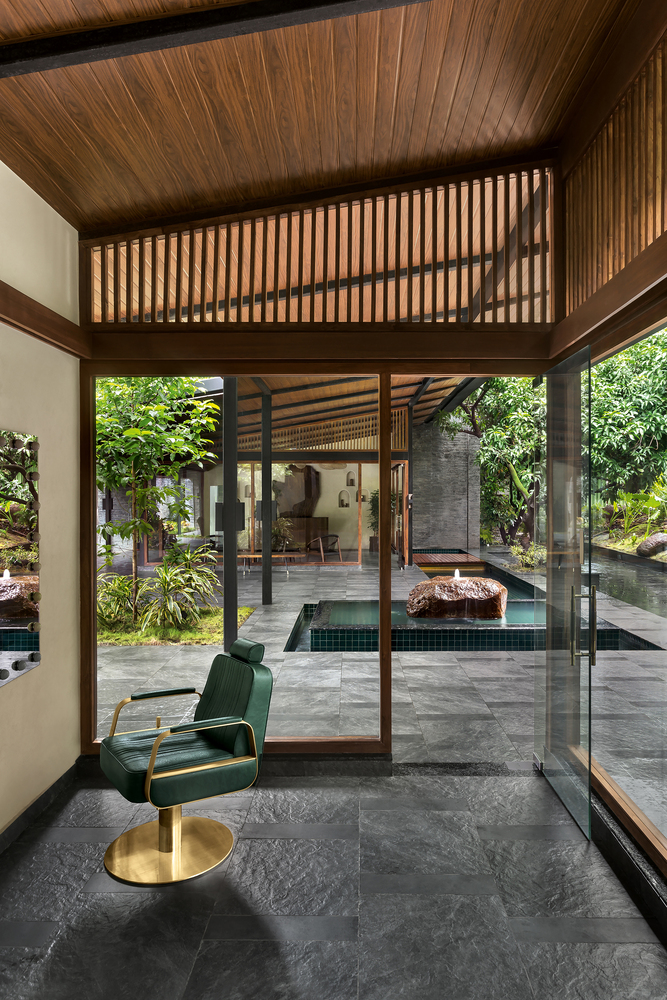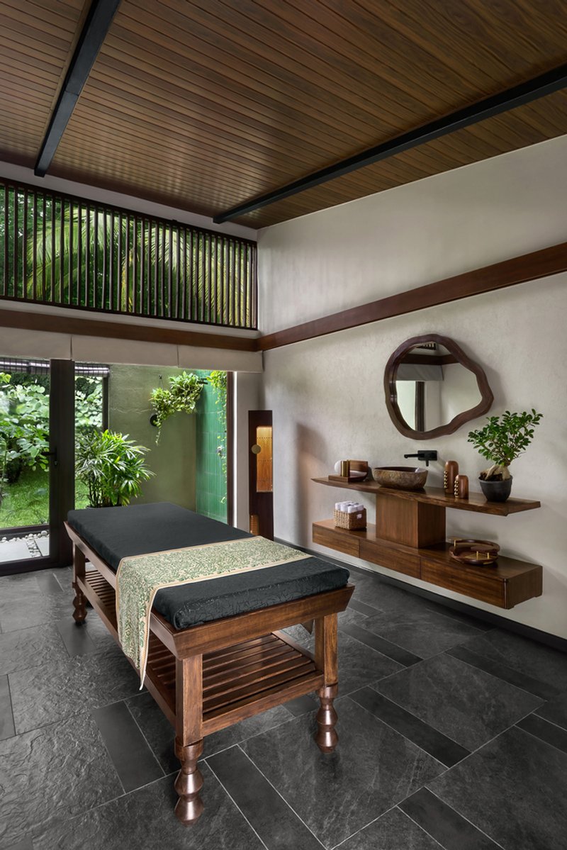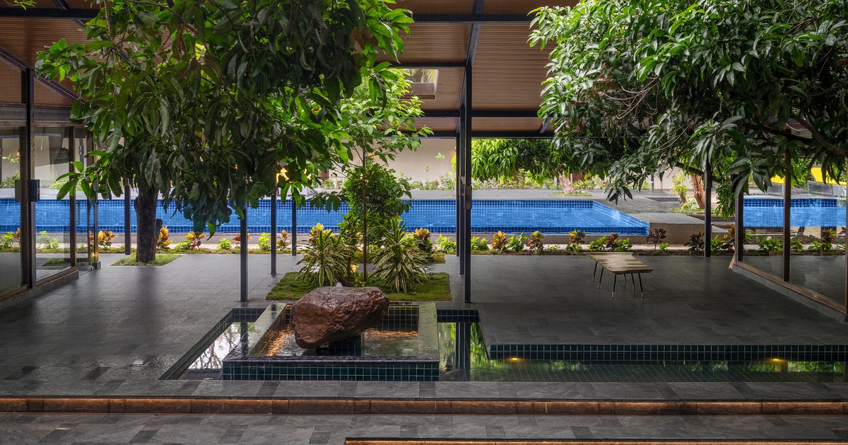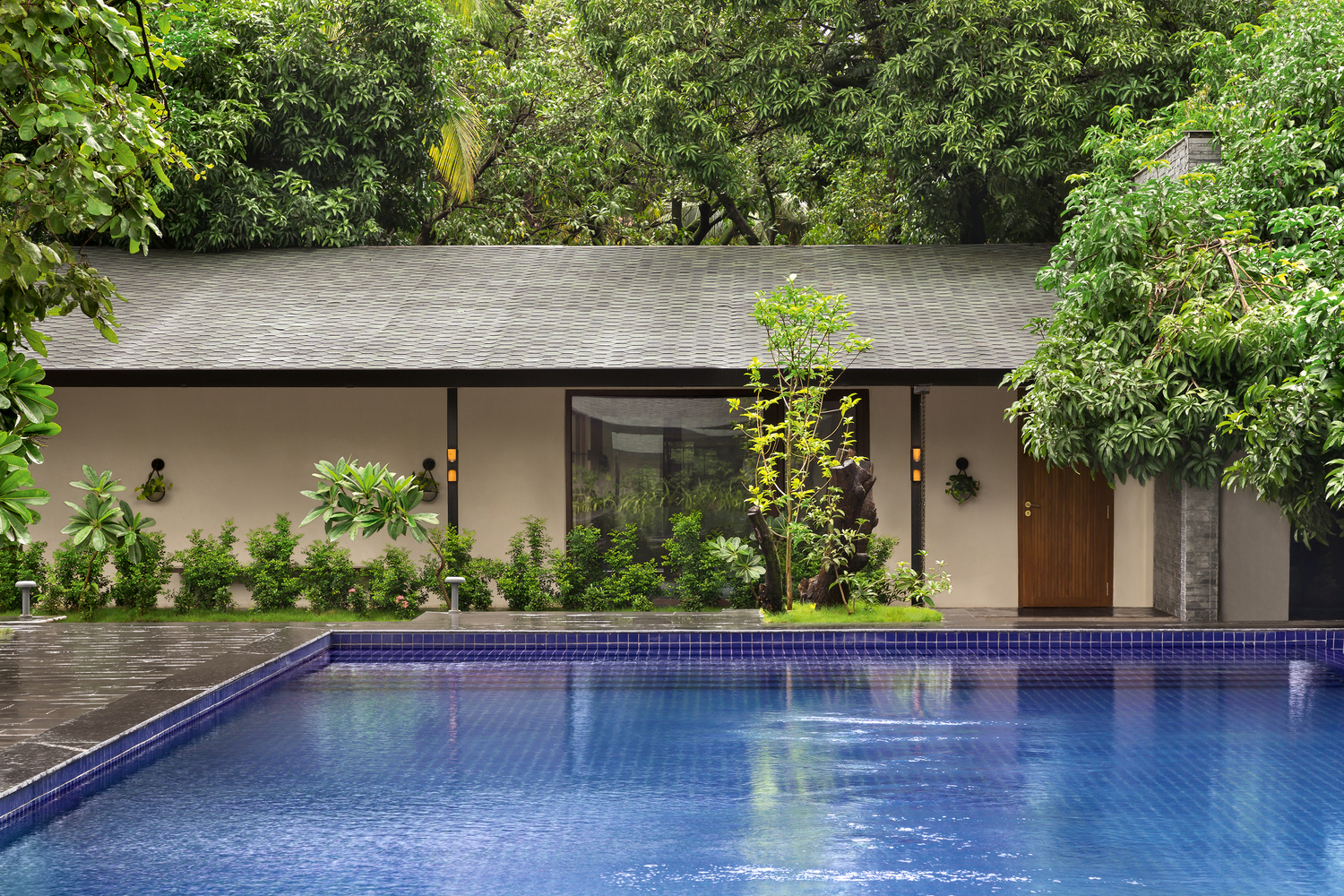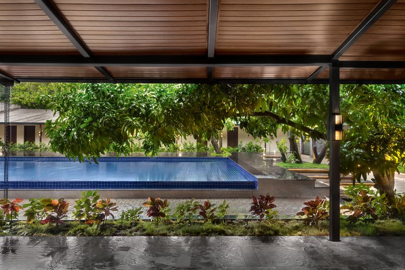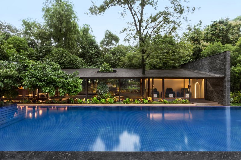 Flanking the pool are two smaller wings that house gender-specific changing rooms, each equipped with sauna and steam facilities. The fourth wing accommodates single and couple spa rooms, with each space opening to secluded green courts and open-sky showers. These outdoor pockets become meditative zones, reinforcing the centre’s philosophy of connectedness with the environment.