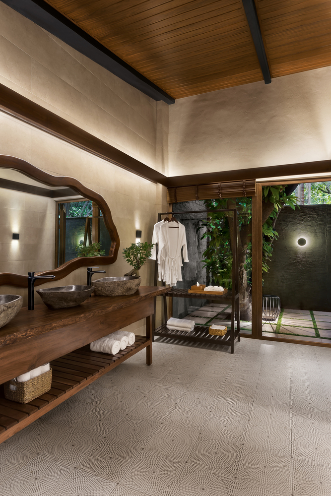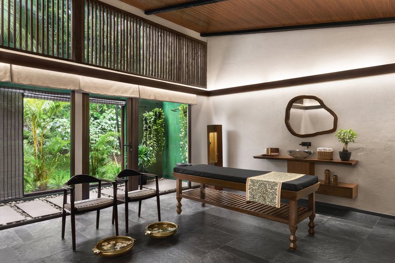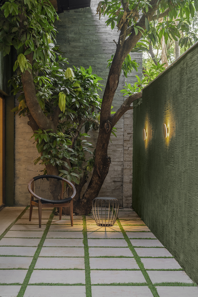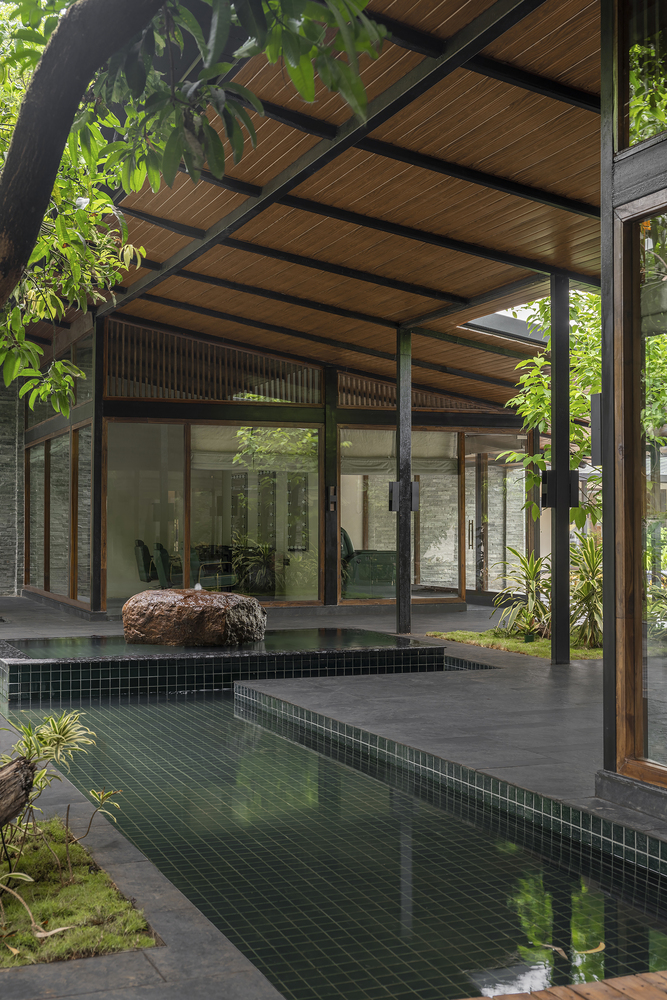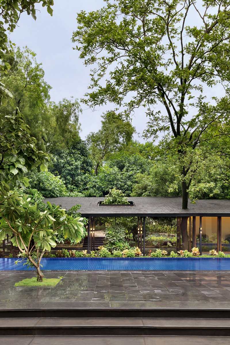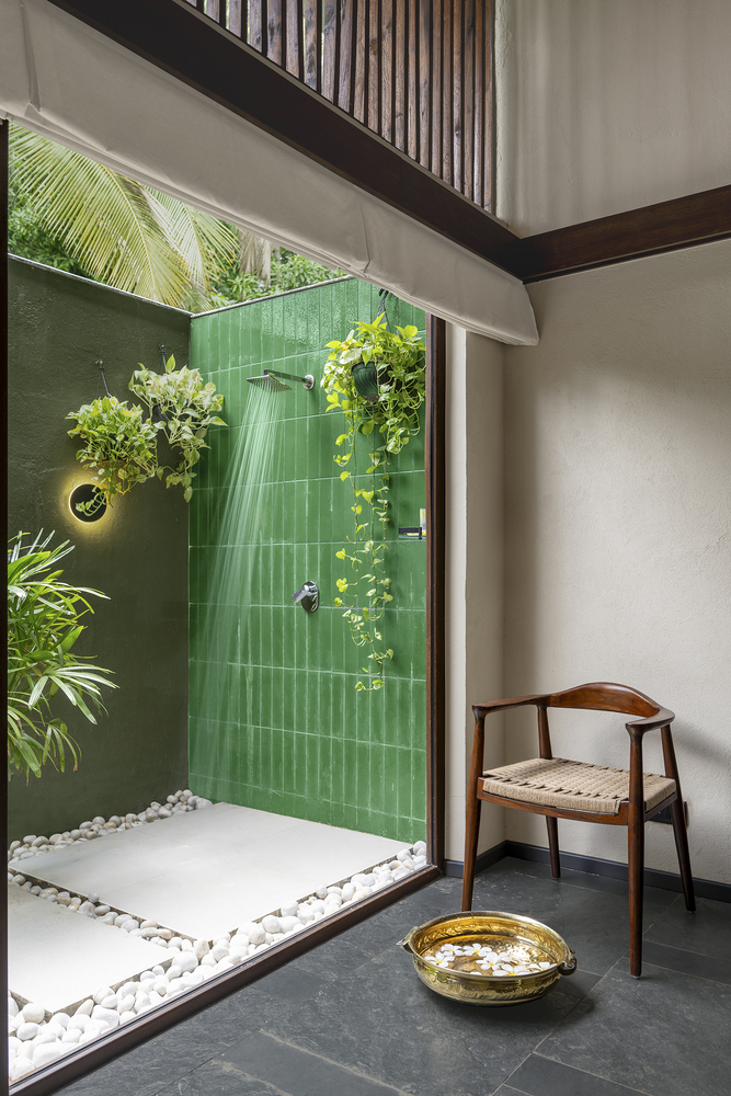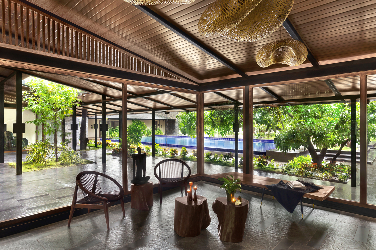 Flanking the pool are two smaller wings that house gender-specific changing rooms, each equipped with sauna and steam facilities. The fourth wing accommodates single and couple spa rooms, with each space opening to secluded green courts and open-sky showers. These outdoor pockets become meditative zones, reinforcing the centre’s philosophy of connectedness with the environment.