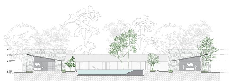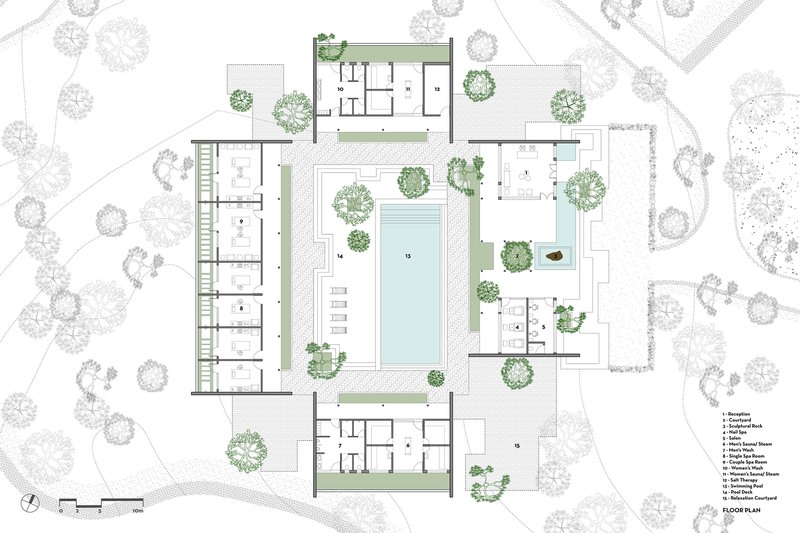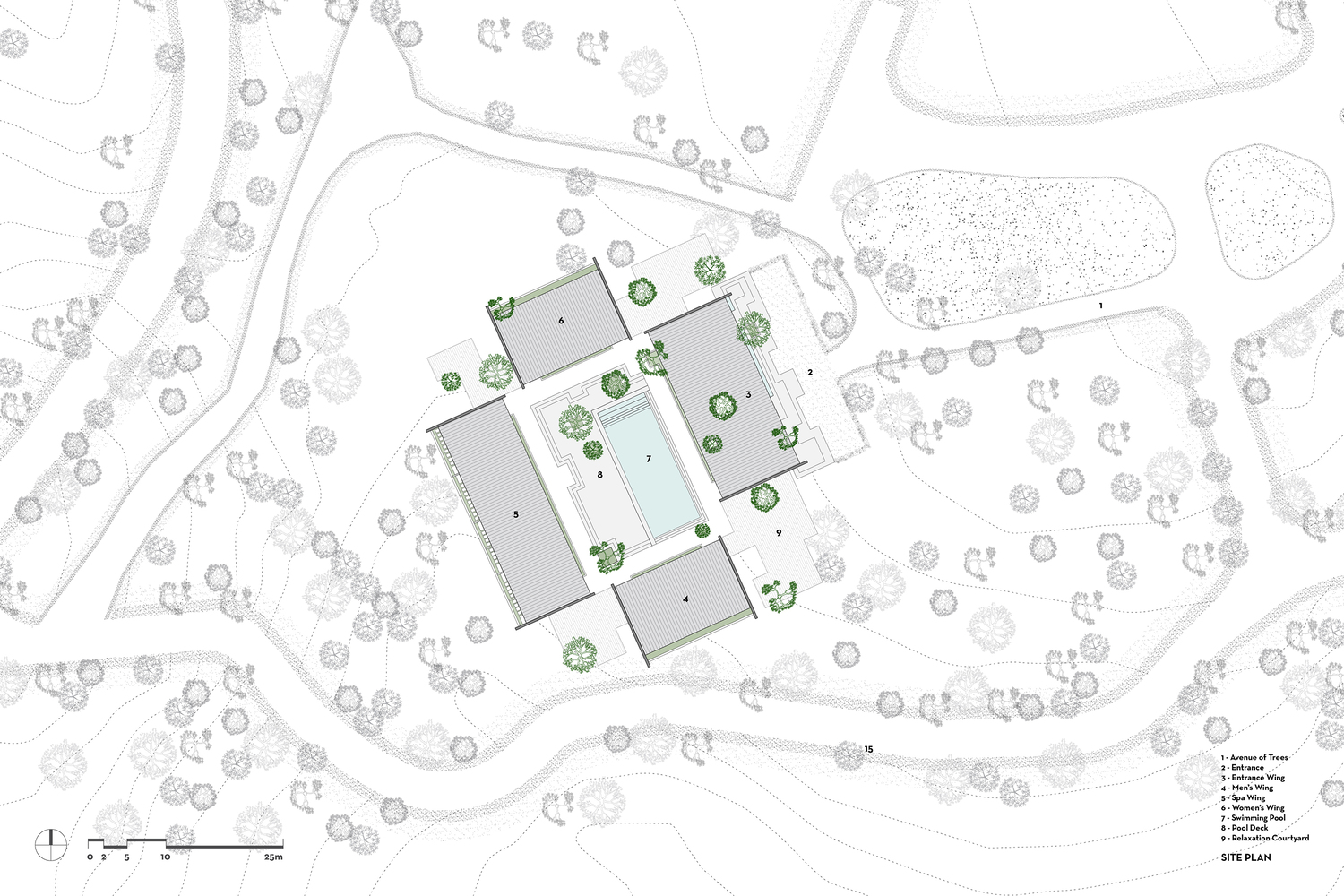 The Eutierria Wellness Centre is composed of four independent wings that radiate around a central swimming pool. This expansive water body serves as both a visual focal point and a space of relaxation. The layout promotes intuitive movement through the site, aligning with the principle of designing for experience.