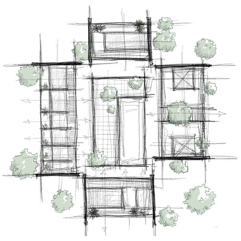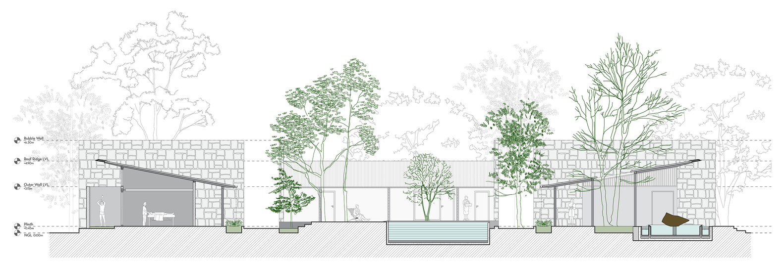 Urban Circle’s design philosophy of creating environments that gently immerse into their surroundings is vividly realized here. Trees grow through the roofs, frame the spatial volumes, and serve as anchors to the architecture. Each tree is respected as an element of the composition, enhancing the natural rhythm of the site and establishing a spiritual connection to the landscape.