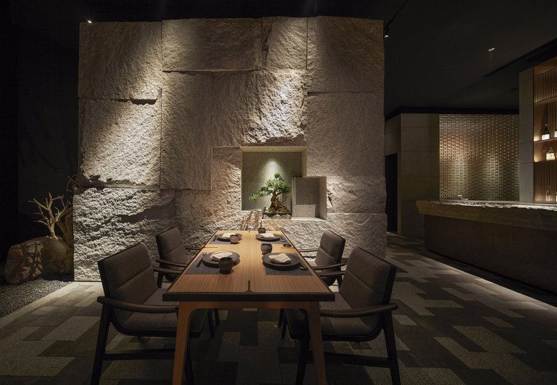 The PDRs (private dining rooms) are the main dining areas of the restaurant, and each is designed as an independent architecture with a unique facade. The rough rocks used in the exterior facade are applied without excessive processing, expressing reverence for the force and aesthetic shape created by nature. The interior decor is designed with diagonally-arranged planning in the rectangular space of PDRs, sushi counter, and Teppanyaki counter, creating small interior gardens that maintain PDR privacy.