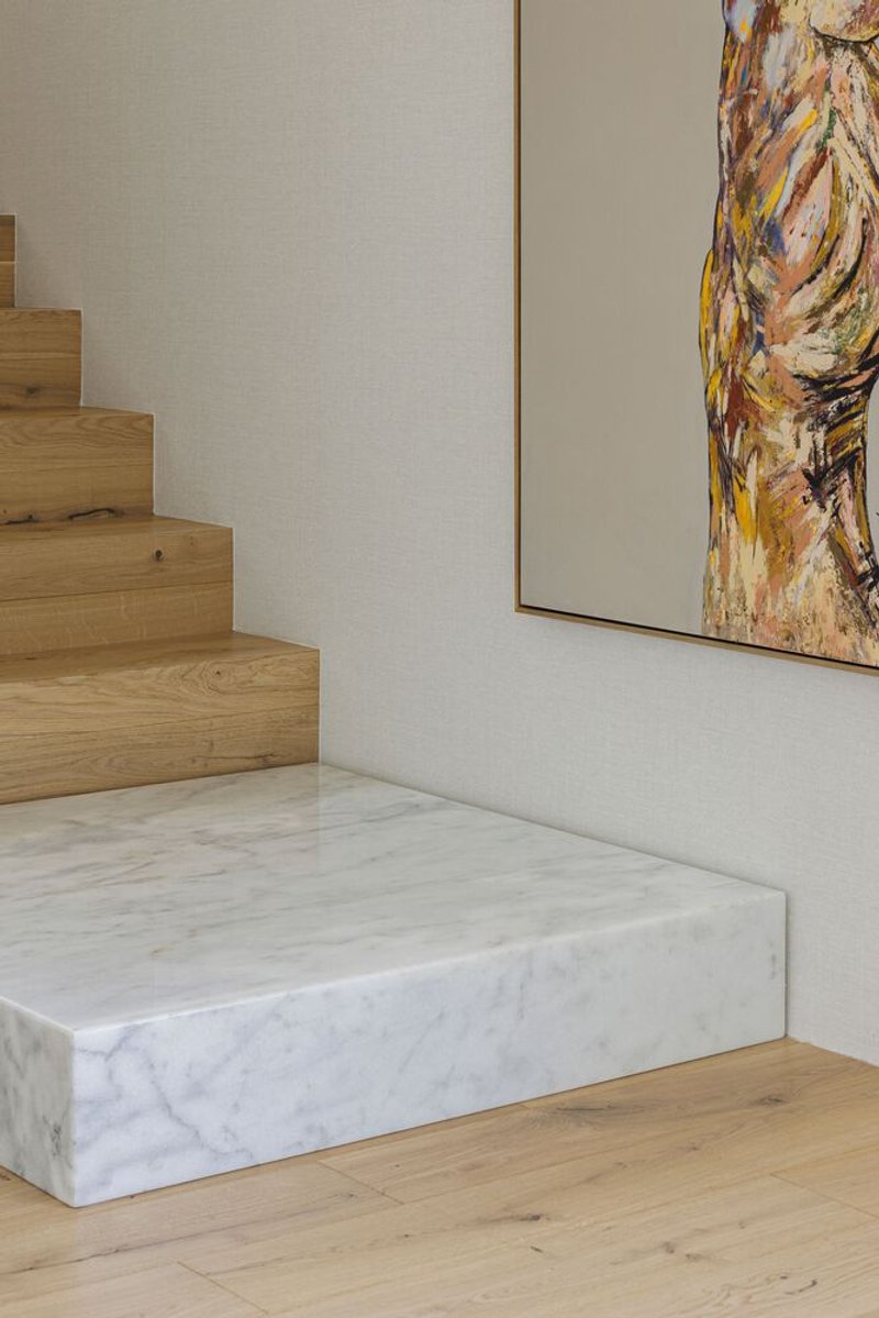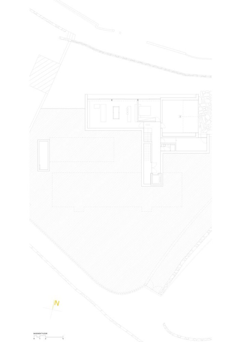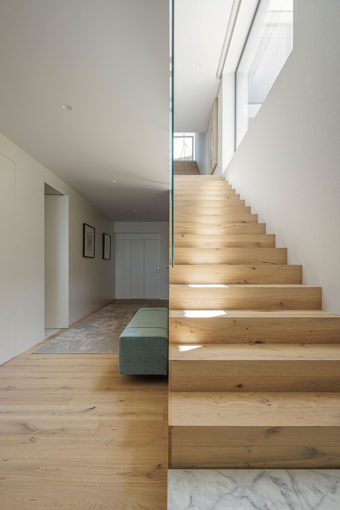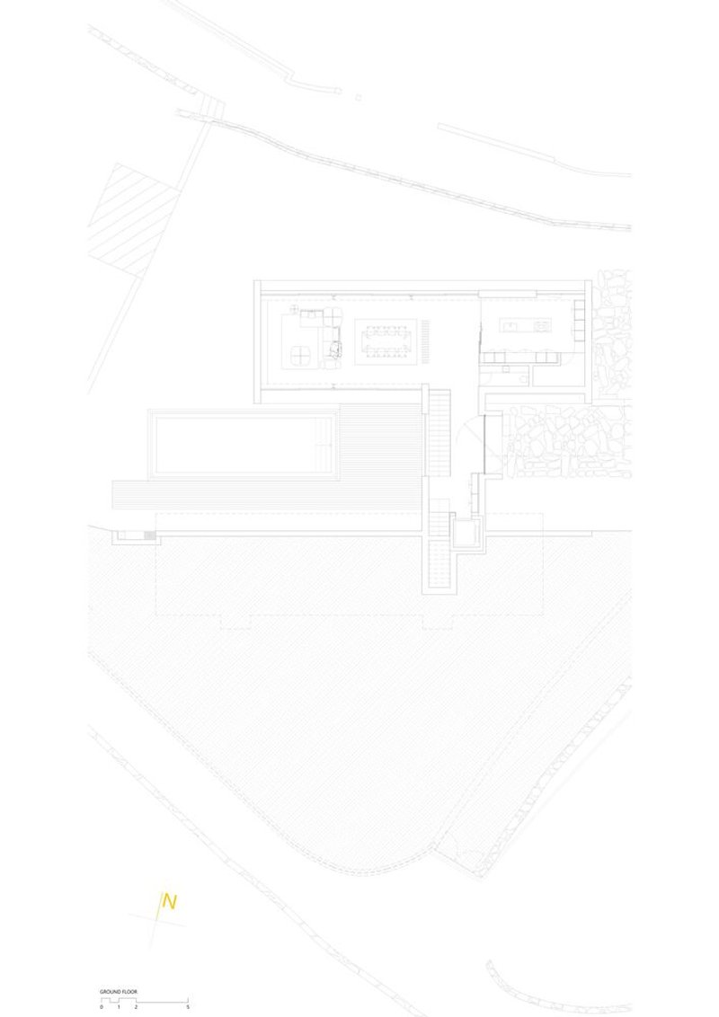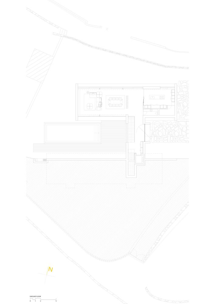 The upper level is dedicated to private and intimate spaces, offering a serene retreat with the landscape as a picturesque backdrop. Large windows frame the exterior, ensuring that the beauty of the surroundings becomes an integral part of the interior experience.