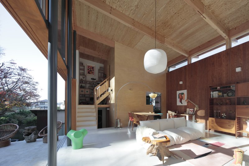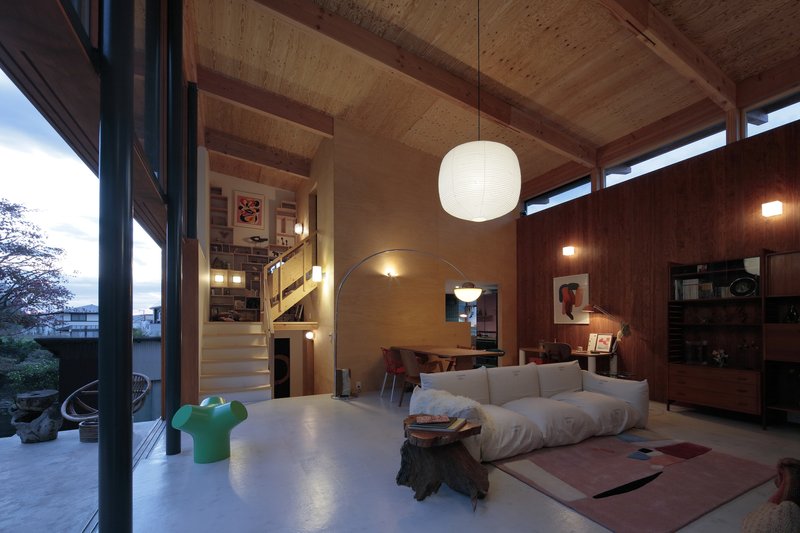Central to the design of the Stage in Hayama are its living spaces, elevated one meter above the first floor, creating a layered effect that enhances the interior's connection to the outdoors. This arrangement allows for expansive views and sunlight penetration, thanks to a towering 4.5-meter high window facade. Structural integrity is maintained by wooden main structures supported by steel columns and beams, showcasing a blend of traditional and modern materials.