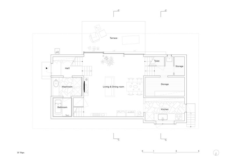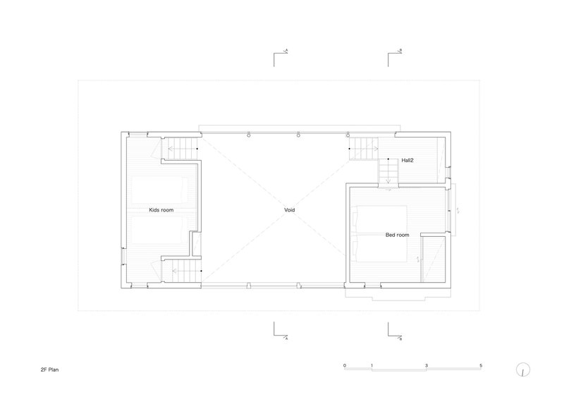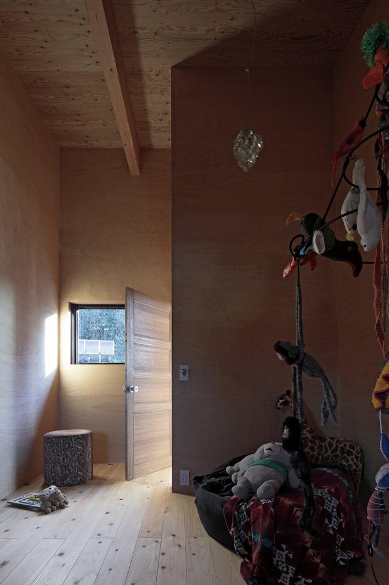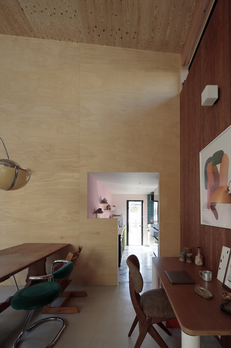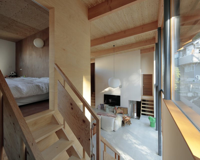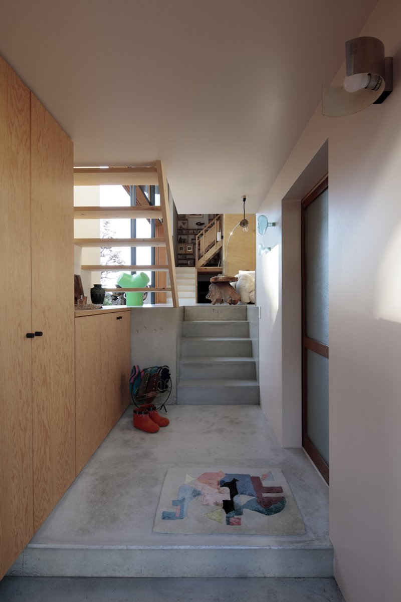 The interior of the Stage in Hayama reflects a minimalist aesthetic with functional spaces arranged around the central living area. The use of different materials in wall finishes provides varying atmospheres throughout the home, adapting to the orientation of furniture and the natural light’s play across surfaces.