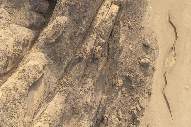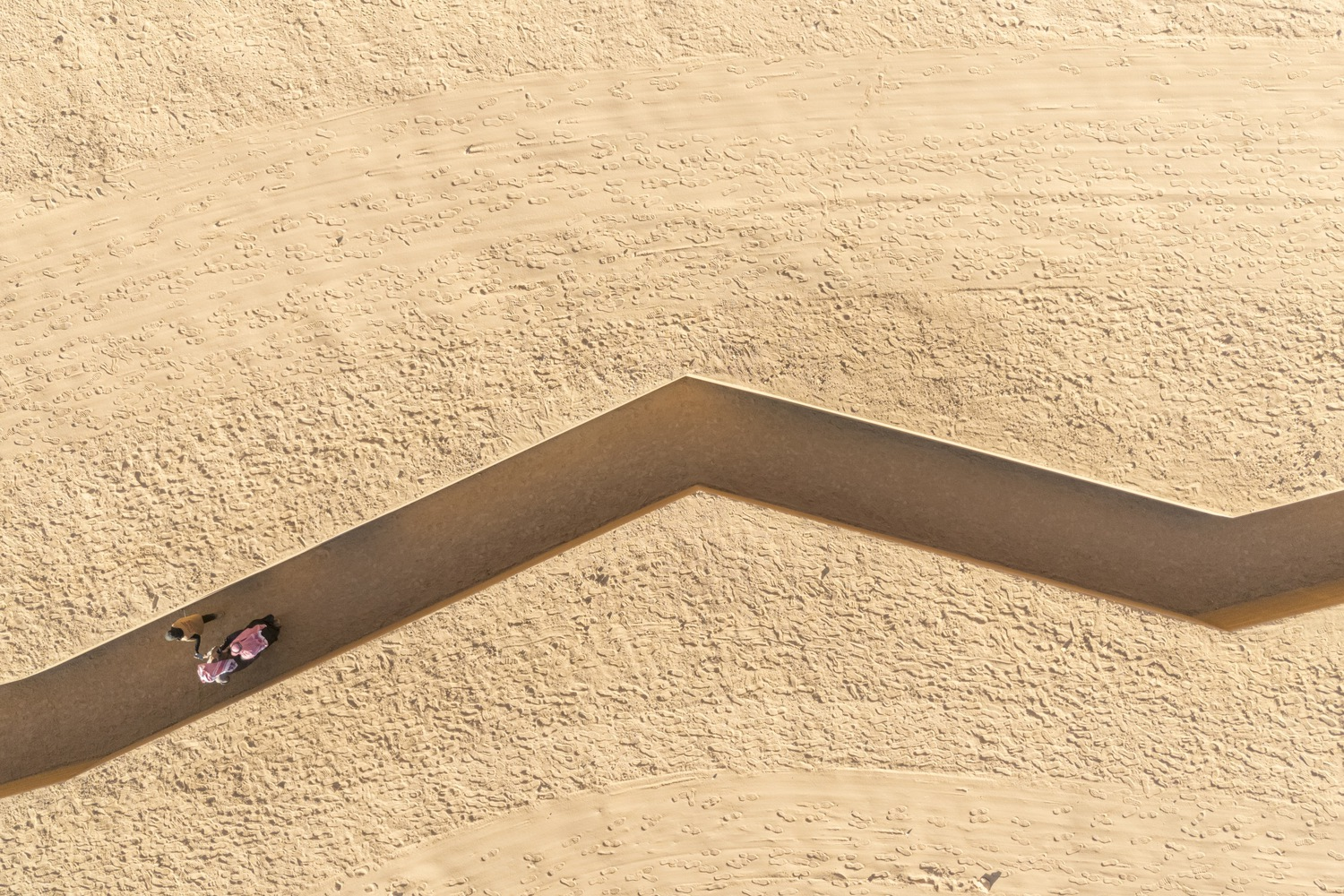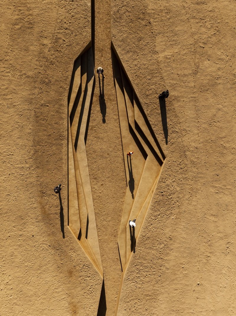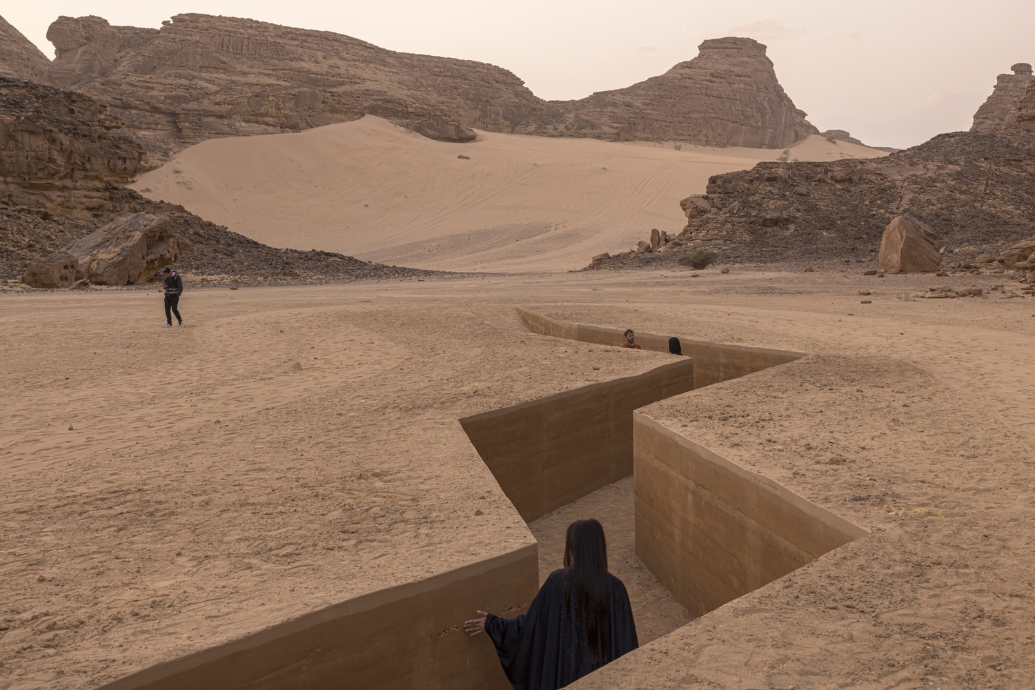 The physical layout of the installation is dictated by the specific conditions of the site, with SYN Architects taking a responsive approach to design. The structure is composed in a way that enhances the viewer's experience of the surrounding landscape, making use of natural light, shadow, and the organic forms of the desert.