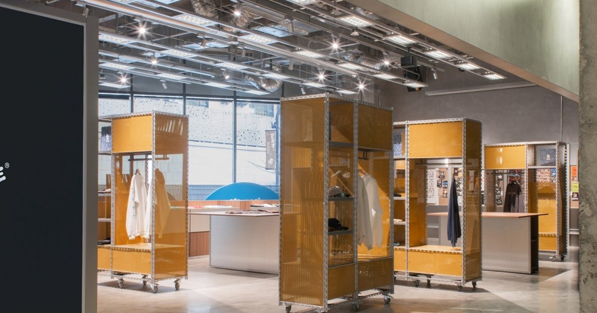 According to WHY WOULD, the store is designed to express the inner core ideas of the brand spirit and construct an impressive and unique space suitable for multiple functions. The overall display system design for the space is flexible and mobile, with display shelves that match the brand's temperament and provide good functionality. Each display shelf is a unit that integrates costume and ornaments storage and provides convenience for daily operation through limit signs that pass through the ground.