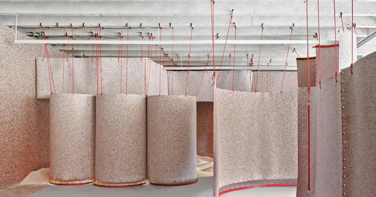 In collaboration with TARKETT, a leader in sustainable surfaces, the installation investigates the life cycle of synthetic materials through a poetic and critical lens. The centerpiece is a series of seemingly massive, two-meter-thick curtains crafted from vinyl that mimics the texture of granite. These "levitating" elements float above a crushed version of the same material—highlighting the recyclability and regenerative potential of contemporary industrial design.