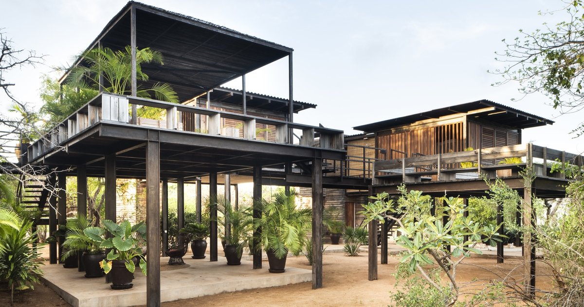Falcon House showcases a conscious approach to material selection, prioritizing recycled and locally sourced materials. Pre-existing bungalows were carefully deconstructed, allowing for the reuse of wooden planks. The use of corten steel for roofing and prefabricated concrete blocks for construction reflects a blend of modernity and respect for traditional craftsmanship.