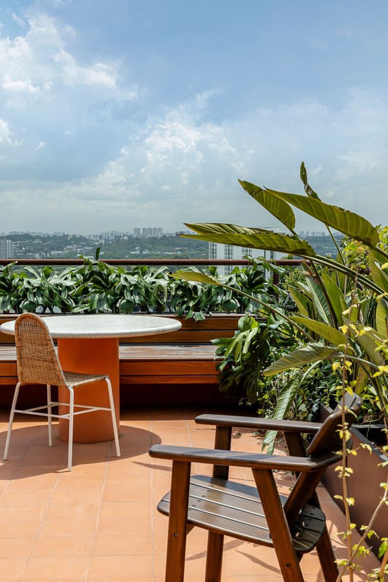 Materiality plays a foundational role: stainless steel, brass, natural wood, and stone create tactile tension between industrial precision and artisanal comfort. Terracotta tiles run throughout the social level, anchoring the palette in earthy tones and Brazilian craft heritage.
