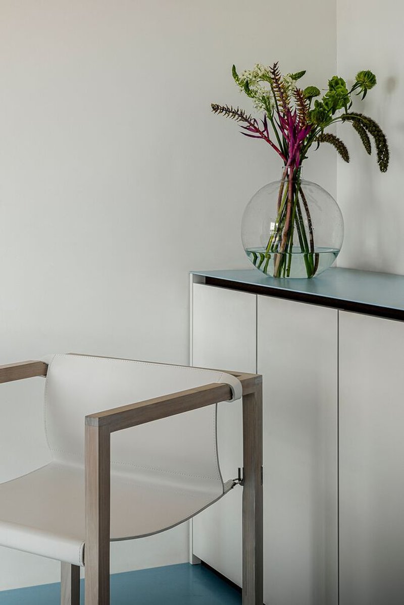 Bathed in natural light and framed by open views, the penthouse features a double-height ceiling enabled by its original gabled roof, lending the sensation of a house suspended above the city. This spatial generosity guided the renovation, which restructures the layout to connect the family’s social, professional, and private worlds with precision and warmth.