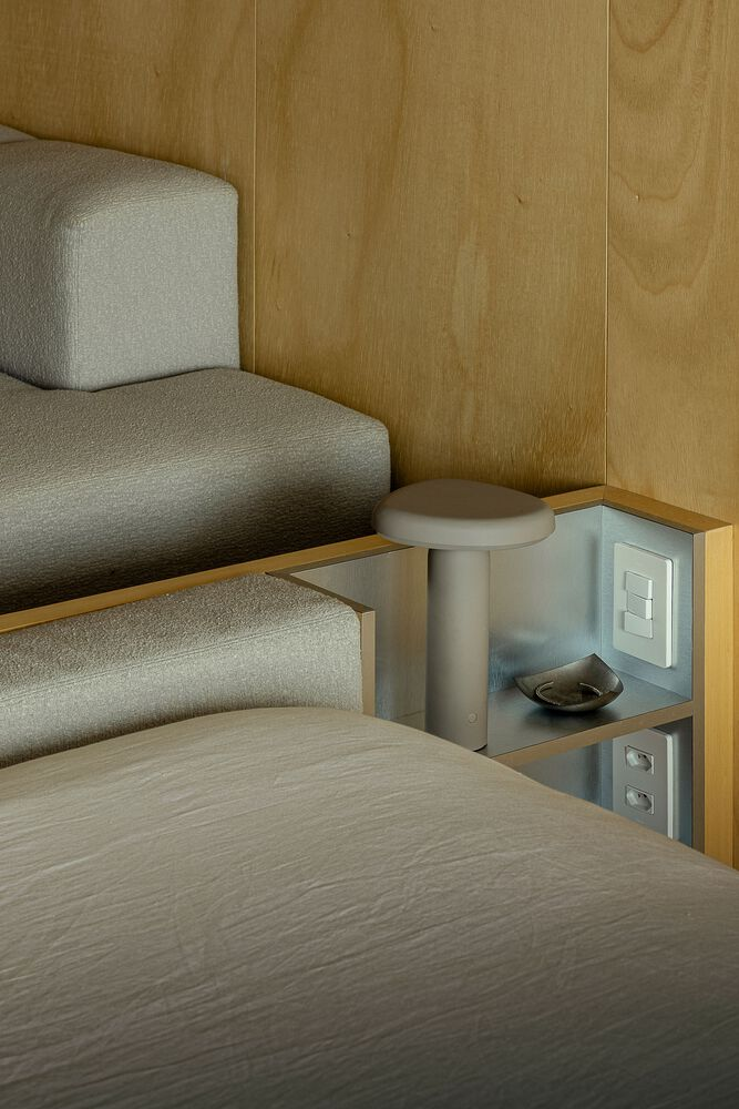The master suite revolves around a central plywood volume, integrating bed, closets, TV niche, and storage — a modular system installed before civil work to ensure precision and efficiency. This elevated platform also acts as a technical floor, hiding utilities while creating subtle level changes and acoustic softness with neutral carpeting.
