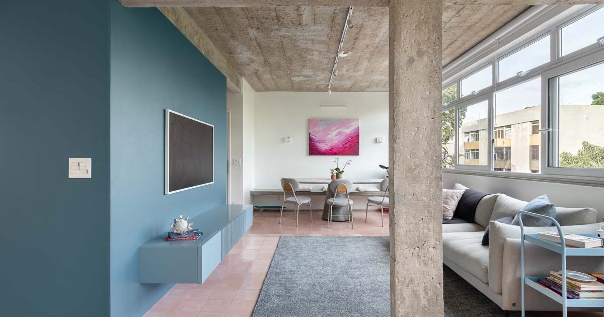 During demolition, the concrete slab ceiling was exposed, adding an industrial touch to the design. The apartment’s color and texture scheme was inspired by a cherished painting gifted to the owner by her aunt, prominently displayed above the dining table. The use of pink hydraulic tiles and soft blue accents complements the artwork, creating a warm, inviting atmosphere. Pastel tones enhance the sense of spaciousness, blending modern aesthetics with personal elements.