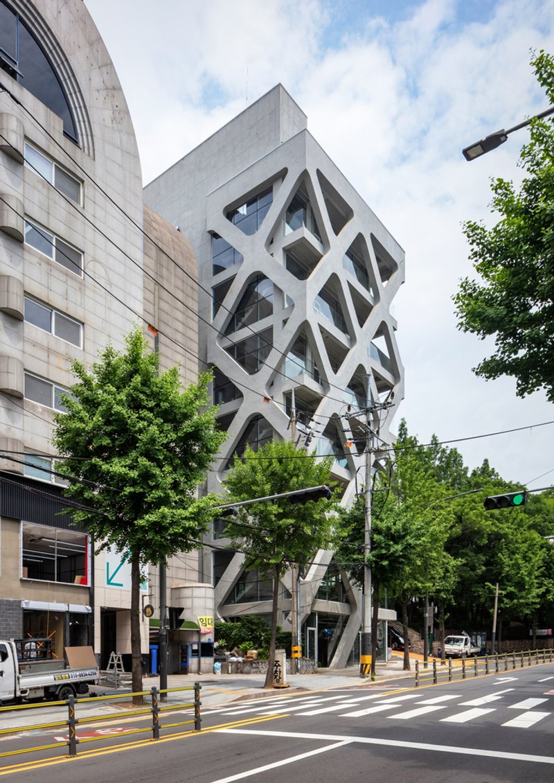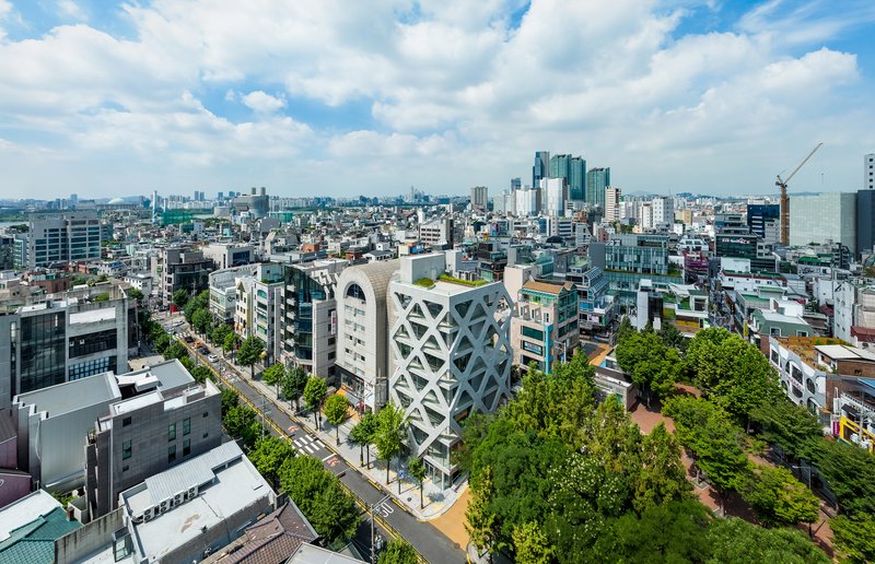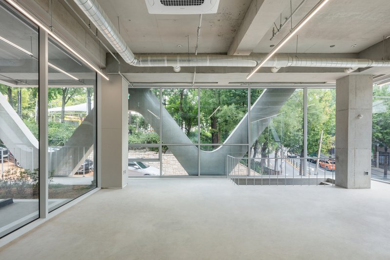 Pedestrians walking past the facility discover a building that offers a moment of respite. The folded concrete surfaces break up the otherwise monotonous urban backdrop, providing a dynamic yet peaceful transition between the hustle of Hongdae and the calm of the park. The building is an oasis of calm amidst the constant flow of activity in the area.