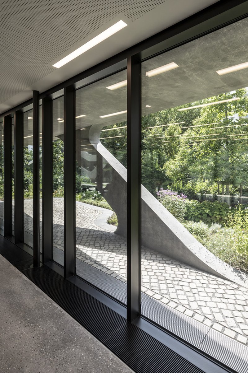 The building’s façade features expansive glazing, allowing for natural light penetration and direct views into the park, enhancing both the spatial quality and the user's connection to nature.