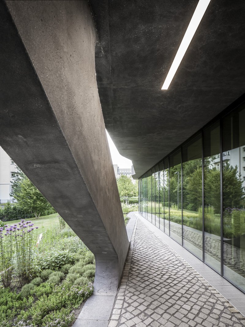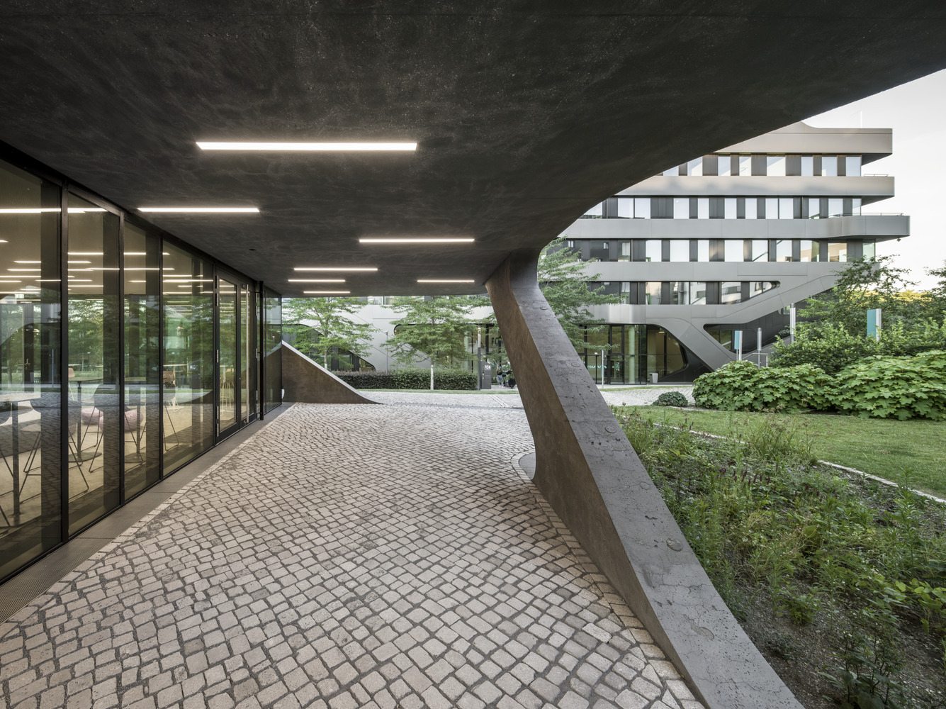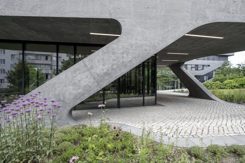 The FOM Hochschulzentrum campus spans 8,000 square meters within Quartier Central, an energetic district repurposed from a former cargo railway yard in Düsseldorf-Derendorf. Five years after the completion of the main university building, the pavilion was conceived as a social and academic extension. It establishes a bridge between built form and parkland, offering a tranquil space for student interaction and academic activities.