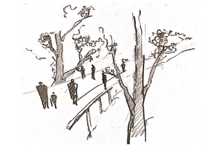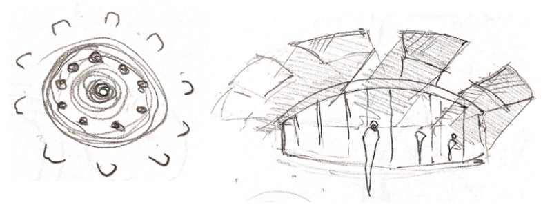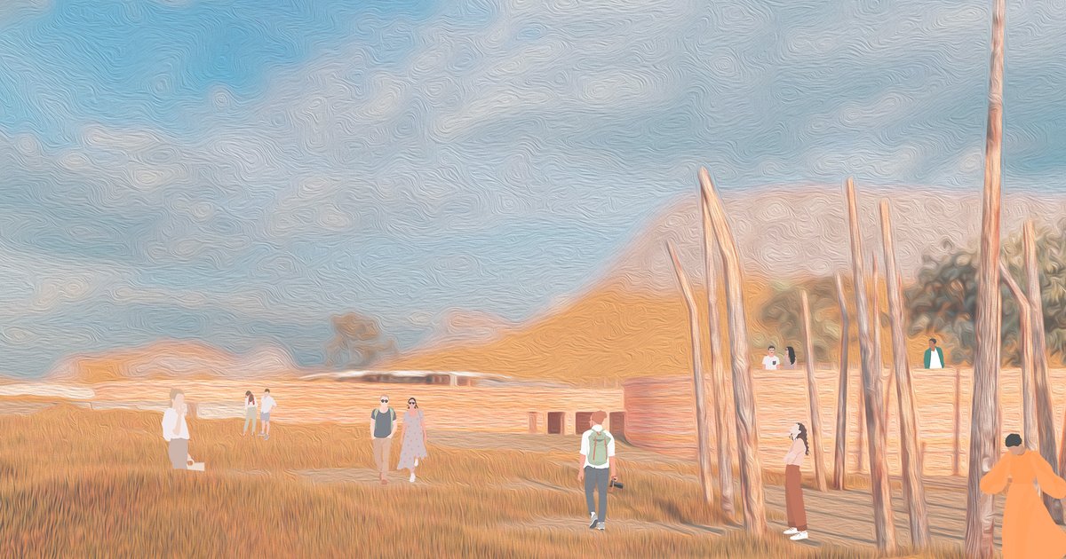 In addition, the entire complex was complemented by features such as a seasonal restaurant and a complex of public restrooms. The premises include a back room and an open area for dining. The form of the pavilion was inspired by an Aboriginal symbol signifying a group of people sitting together to emphasize the dimension of community emerging here. Sheets of fabric attached to wooden stakes that bend under their own weight provide additional shade from the summer heat.