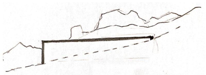 The mass of the building partially emerges from the ground, already making its presence felt more strongly; the angular finial of the building resembles a rock cliff, carrying over on a smaller scale the characteristic elements of the nearby mountains.