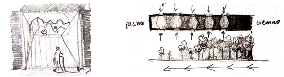 Light is an integral part of the experience of this place, it is supposed to affect the mood and sensations of those who come here. The mosaic of light and dark patches crossing the path of the visit differentiates the dynamics and expressivity of the subsequent zones. Occurring rhythmic, elongated windows cut into the solid wall formation let in bright, piercing sheaves of light that naturally illuminate the volume.