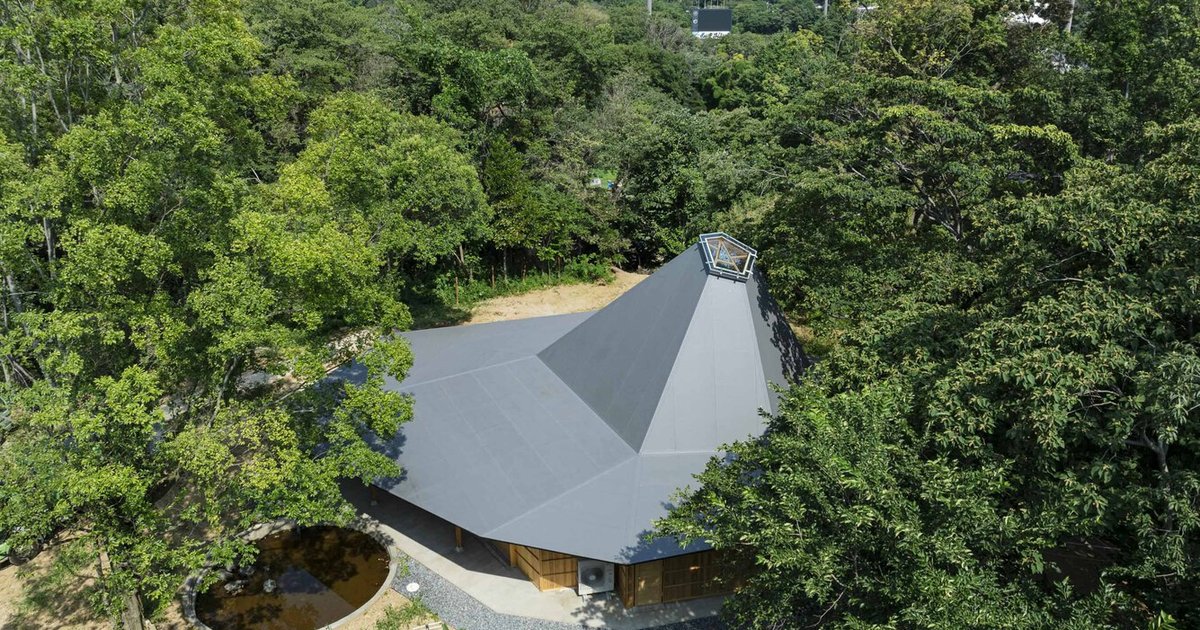 The building’s most distinctive feature is its conical roof, shaped like a witch’s hat, which rises dramatically from the irregular polygonal base. The form is not only iconic but also deeply responsive to the natural surroundings. Its geometry mimics the fragmented outline of the forest canopy, while a wide brim creates generous eaves that extend the usable space outdoors, providing shelter from sun and rain.