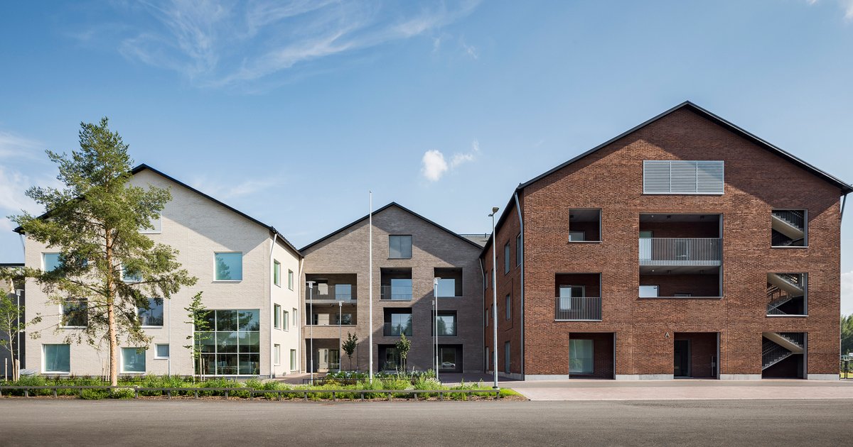 A consistent material palette ties together the interior and exterior architecture of the complex. Brick surfaces play a central role in shaping the building’s identity, creating a tactile and durable façade that echoes the historic industrial architecture of Forssa.
