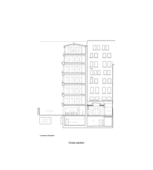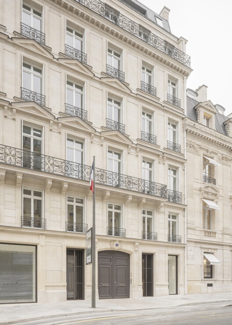Spanning a total area of 2,770 m², the project involved three distinct structures: the main Haussmann-style building, a rear annex pavilion, and a smaller 1970s addition. While the first two historic structures were meticulously rehabilitated, the latter was demolished and rebuilt to seamlessly integrate with the new design. Over fourteen months of careful construction, the architects delivered a mixed-use building combining modern offices, showrooms, and thoughtfully curated interior spaces.