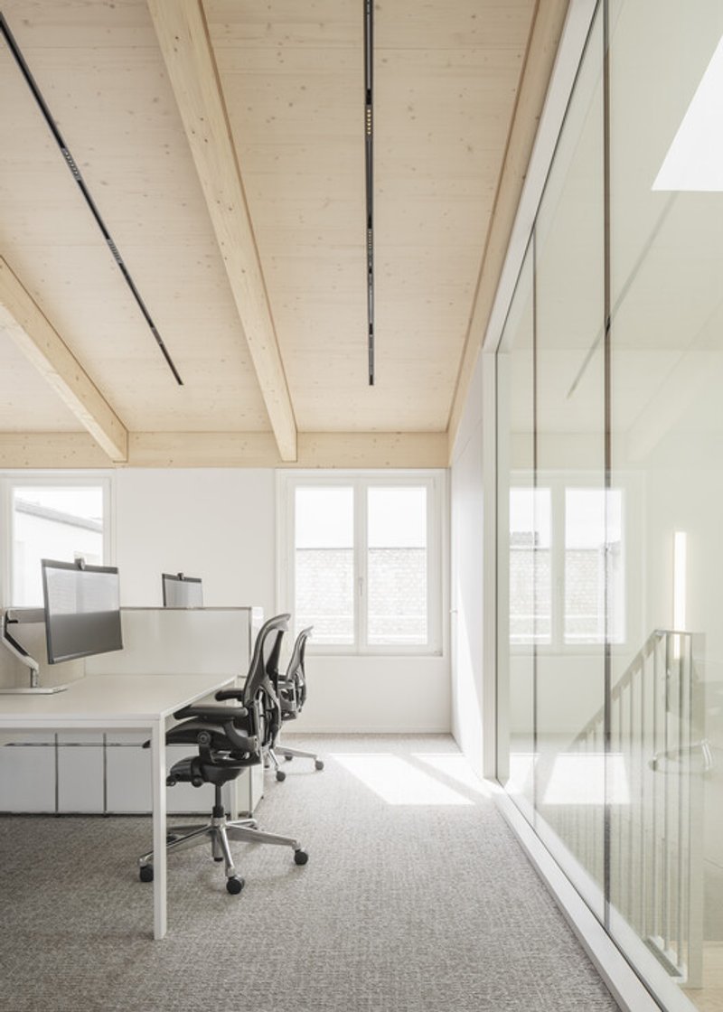 The renovation prioritizes natural light, spatial fluidity, and acoustic comfort. The offices, strategically placed between the street and courtyard, feature generously glazed partitions that create a through-volume with double exposure, allowing light to permeate deep into the workspace. Dedicated areas for private calls and focused work were carefully integrated, enhancing acoustic privacy while maintaining an open, collaborative environment.