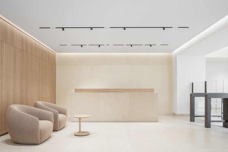 Interior design, led by Sylvia Griño, emphasizes noble and sustainable materials, balancing light tones with warm accents to create a refined and welcoming atmosphere. Bespoke furnishings complement the architecture, reinforcing the building’s unique identity and supporting a harmonious workflow. Social spaces, workstations, and showrooms were designed for flexible configurations, promoting both productivity and well-being.