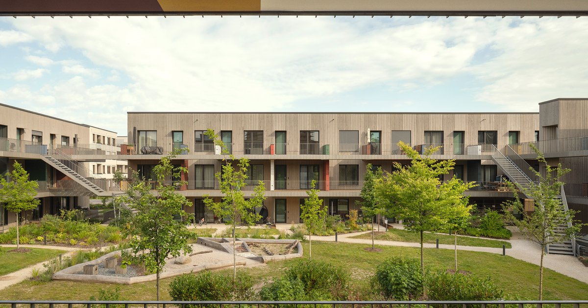 The project emphasizes target group diversity and social inclusivity by offering a wide range of residential typologies. Sauerbruch Hutton’s design introduces four new buildings organized around a shared courtyard, accommodating cluster housing, family units, and compact single apartments. These housing types address varied living needs while promoting affordability and adaptability.