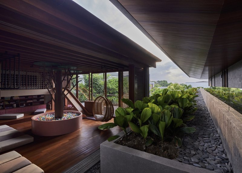 The living room features retractable glass walls, allowing it to transform into a fully open-air pavilion. This flexibility enhances cross-ventilation and maximizes natural airflow—an essential strategy in tropical architecture. A transparent glass floor introduces a bold architectural gesture, offering direct views into the pool below and reinforcing the relationship between structure, light, and water.