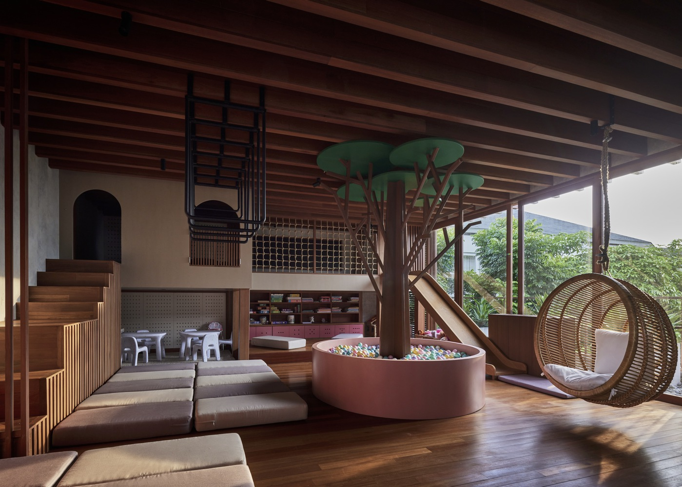 Key sustainable features include passive cooling systems, deep overhangs for solar shading, cross-ventilation corridors, and strategic orientation to optimize daylight while limiting heat gain. The architecture leverages Bali’s tropical climate, reducing dependence on mechanical air conditioning systems and artificial lighting.