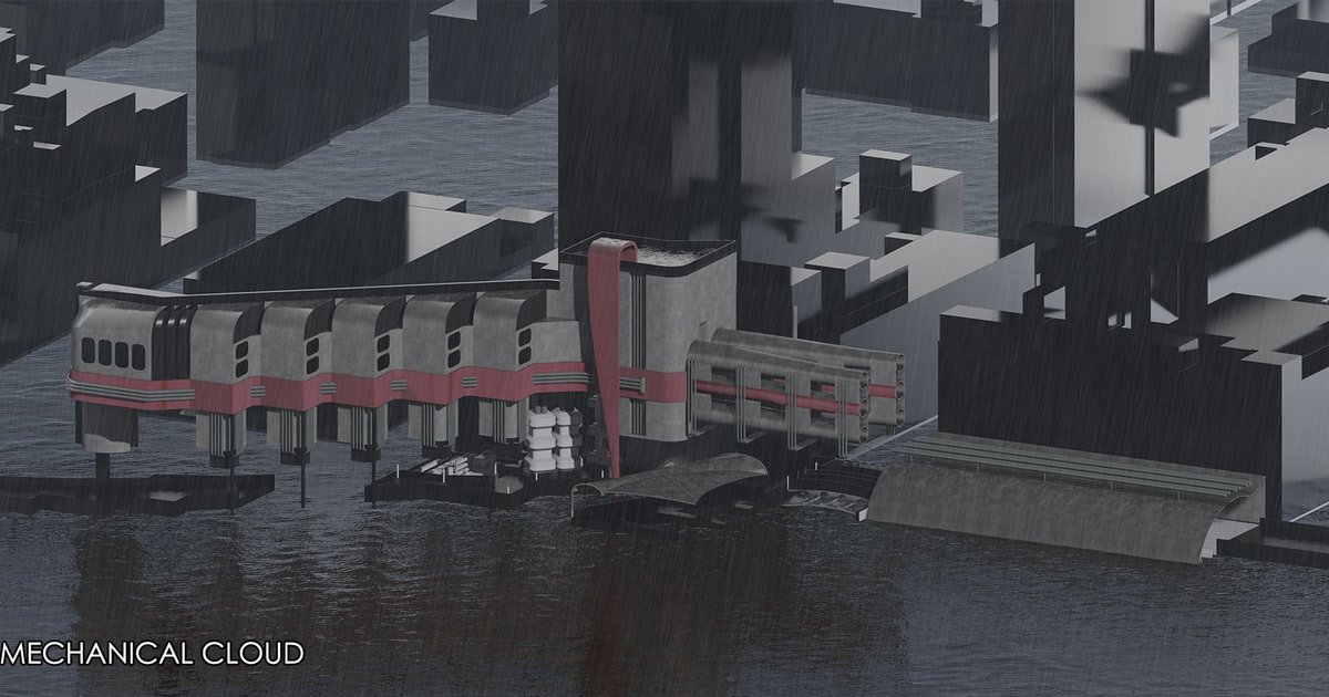 'Mechanical Cloud' emerges as a winner entry in the 'Architecture of the Apocalypse' initiative, reflecting a profound understanding of the climate challenges posed to Manhattan. It represents a fortress of survival and sustainability, constructed upon the historic High Line to serve as an ark against the relentless rise of sea levels.