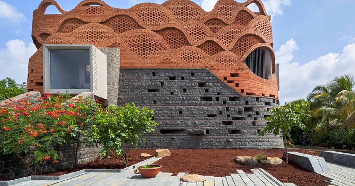 Openings in the lower stone bands are dictated by structural layering. Above them, brick evolves into a breathable honeycomb matrix — a jalis-like perforation system that allows light, wind, and shadow to animate the façade. From the distance, the house wears a crown of brick geometry, timeless yet strikingly contemporary.