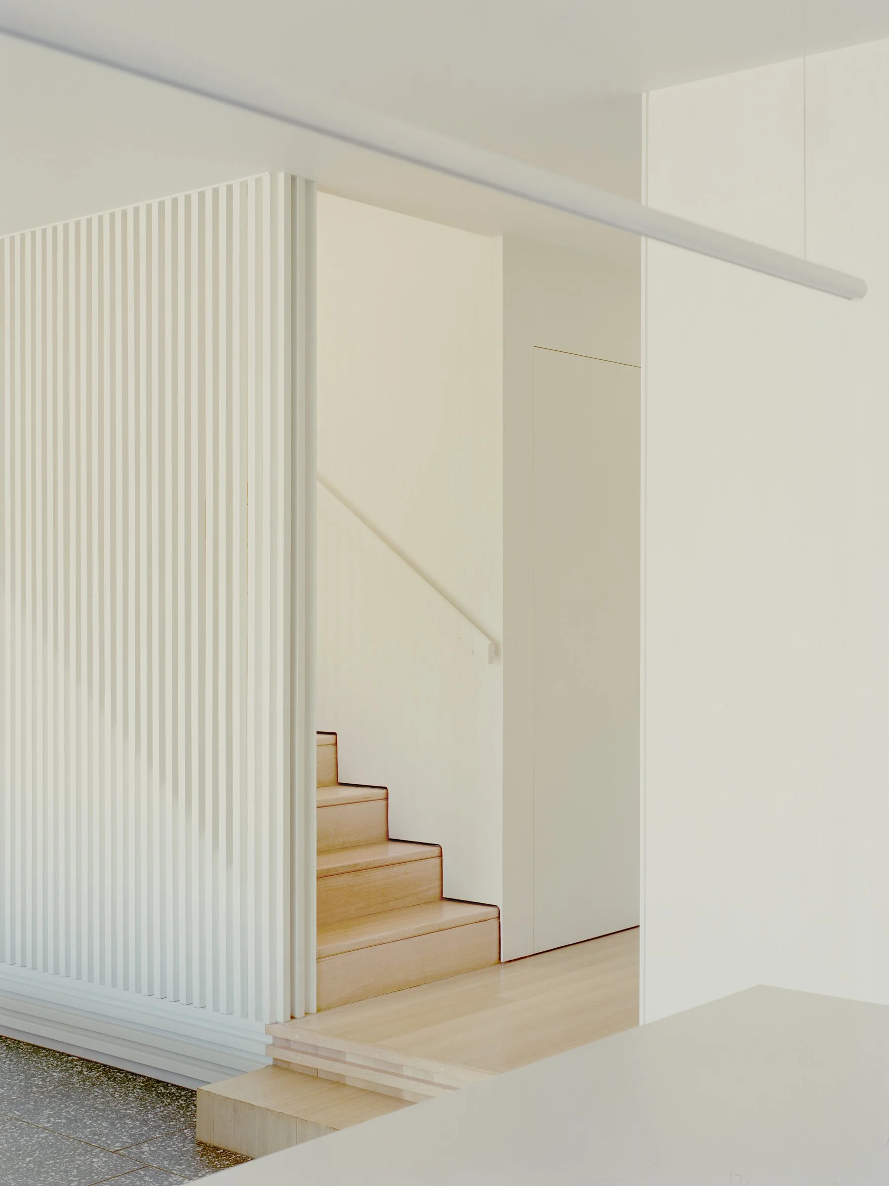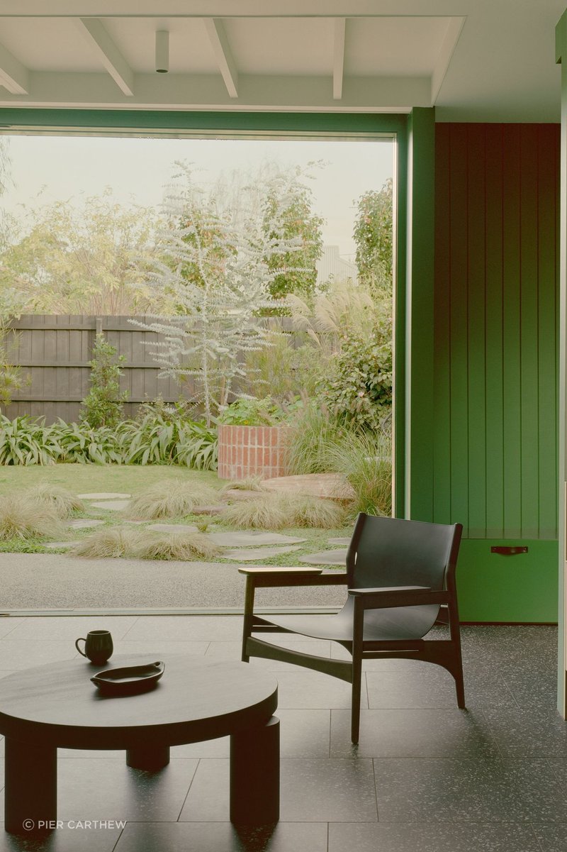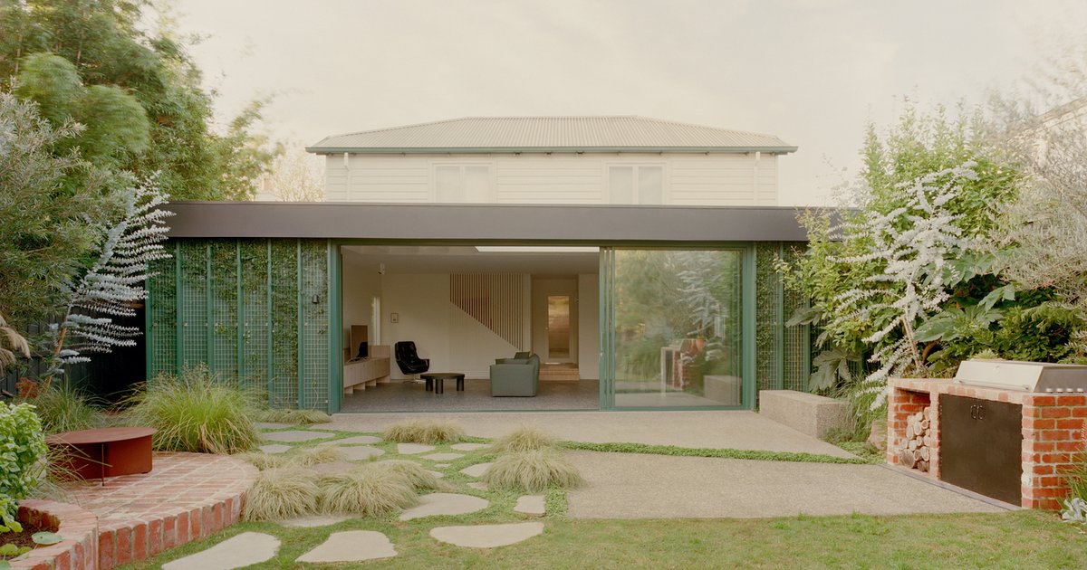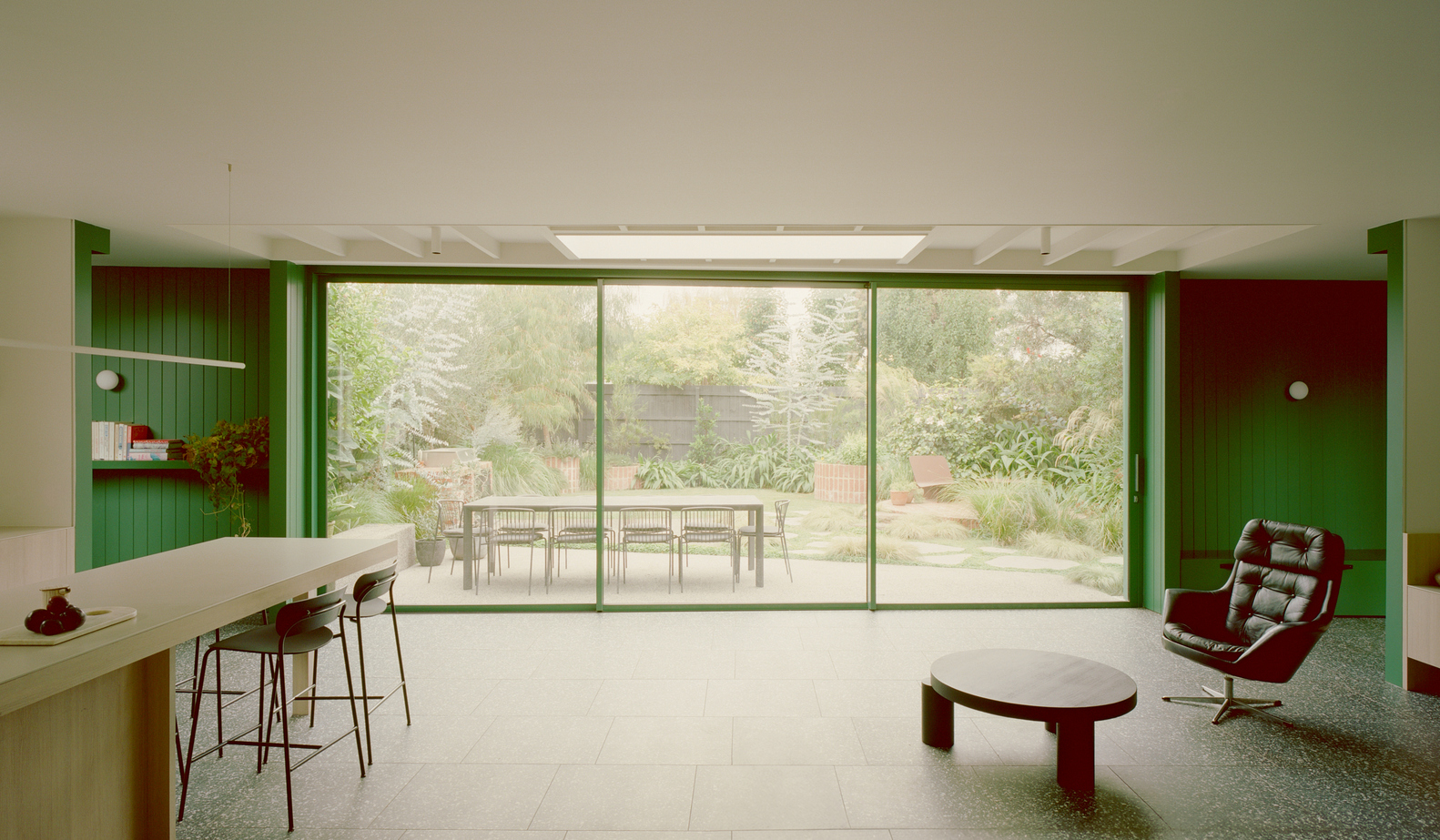 This new addition stretches east–west beyond the original building line, forming entry vestibules that capture the northern aspect. Green battens and espaliered planting establish a rhythmic façade that softens the architecture while celebrating the garden as an integral part of the living experience. Large sliding doors open wide to frame expansive views of greenery, and a strategically placed skylight brings daylight deep into the home, illuminating the interior with warm, natural light.