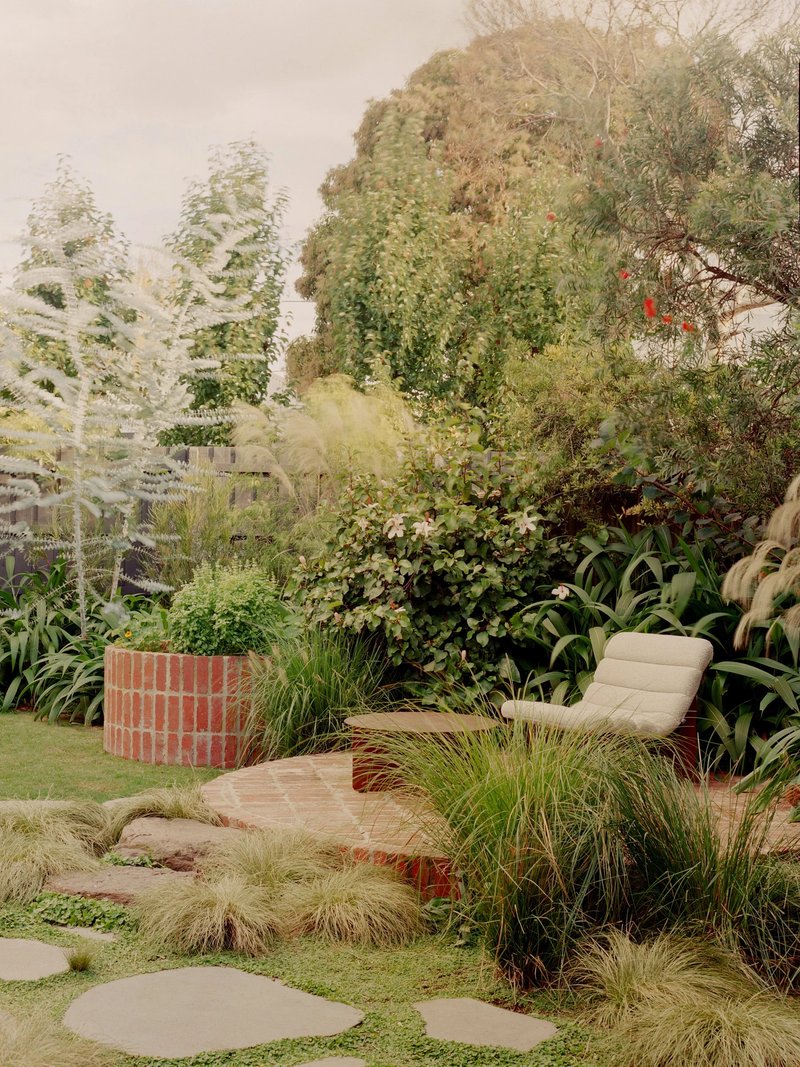The outdoor environment becomes an extension of the home’s social spaces. A paved dining terrace and landing offer a fluid transition between interior rooms and the lawn, while a raised brick plinth doubles as an informal seating spot designed to capture sunlight. Brick vegetable beds, a built-in barbecue, and curated planting by Peachy Green landscape designers contribute to a functional and delightful backyard designed for everyday enjoyment.