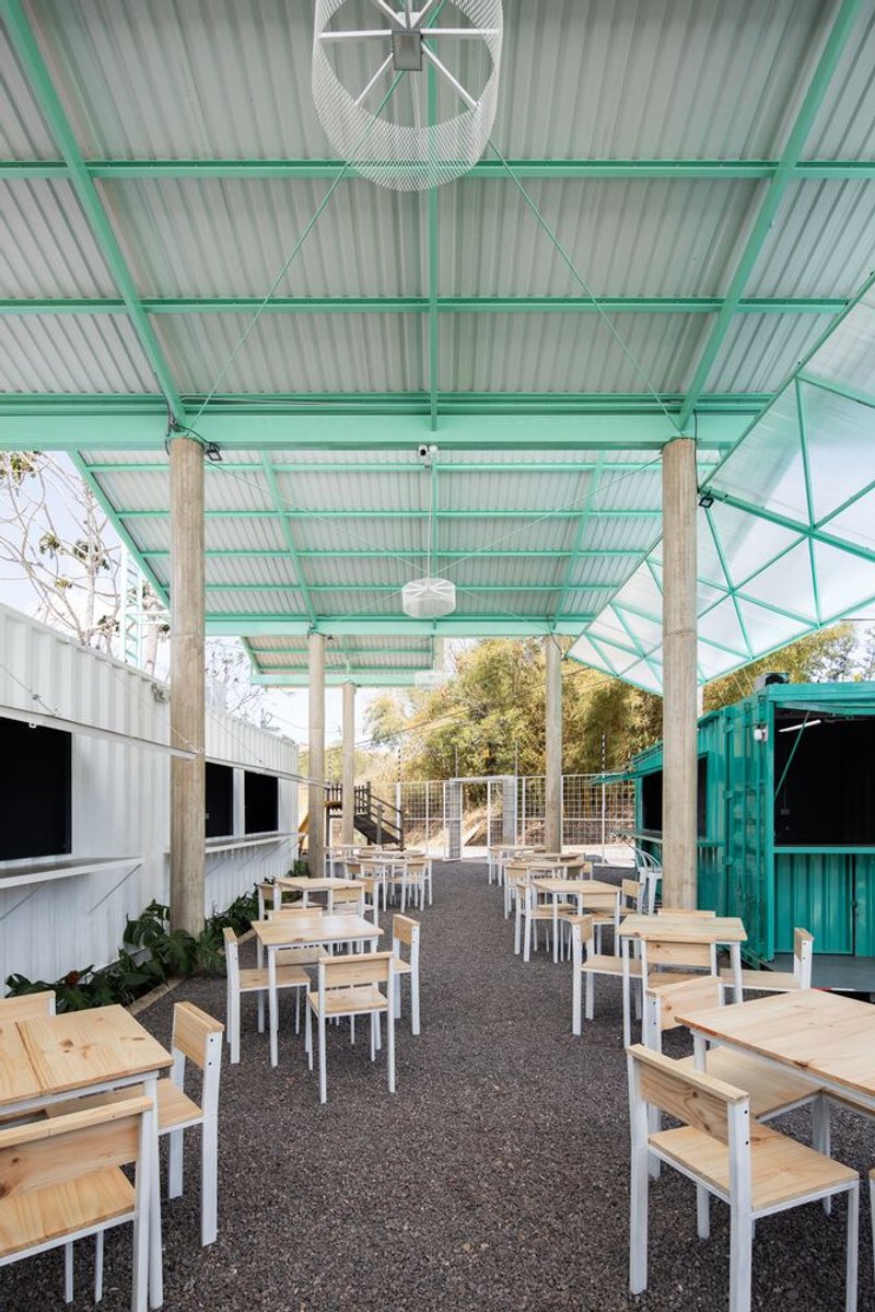 A key strategy in the project’s development was geometric abstraction, where the canopy form was explored through iterative exercises, enabling both aesthetic refinement and technical resolution. The architects utilized the building section as a central tool to organize spatial flow, structural logic, and functional adaptability. This sectional approach ensures that the previously acquired modular containers integrate seamlessly, maintaining flexibility for future modifications and expansions.