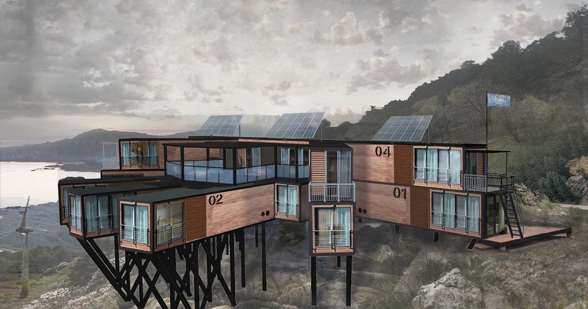Accommodation containers can be of three types: double, triple, and one family room. A bathroom, a small kitchen area, a sleeping area, and a work area are provided in each living room. The second floor has a covered terrace for relaxation, solar panels are installed on the roof, and external stairs are provided for the second floors.