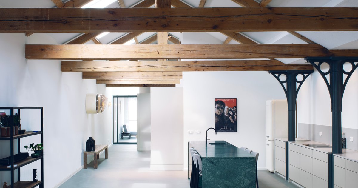 A historic Amsterdam warehouse transformed into a sustainable, light-filled apartment blending modern comforts with original industrial character and craftsmanship.
