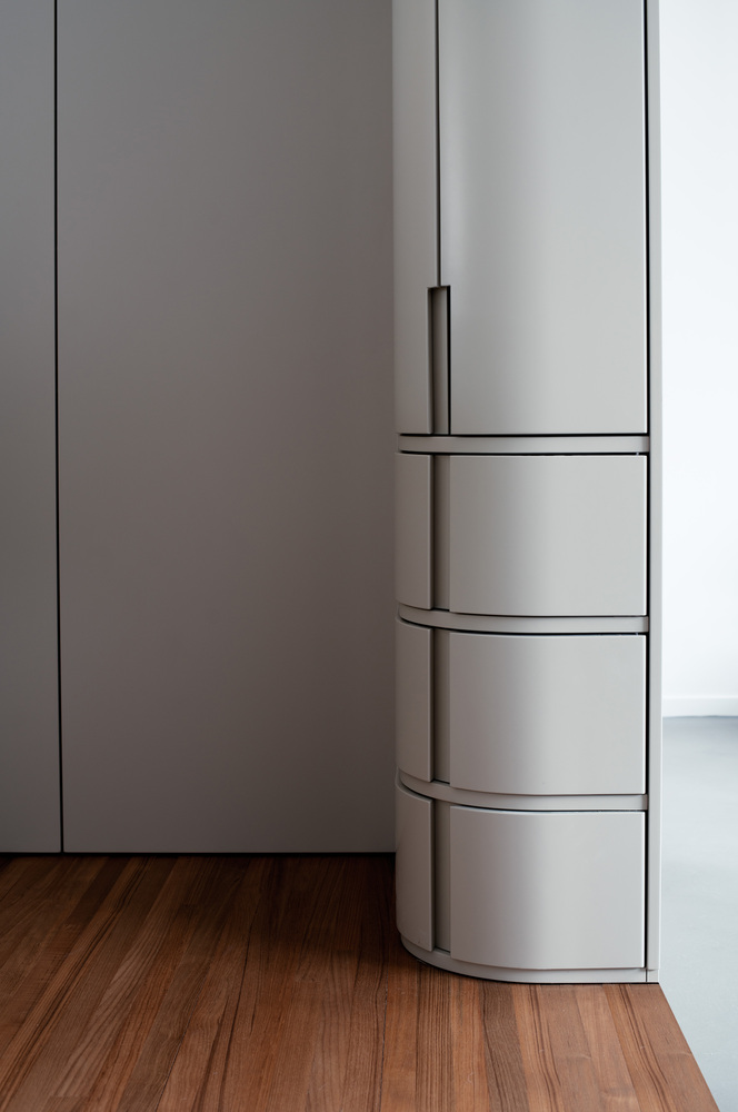 Central to the design is a custom-built architectural element that subtly organizes the apartment. This single, multifunctional volume delineates secondary functions—such as the guest bedroom, storage, and sanitary areas—while simultaneously integrating cabinetry and creating a fluid circulation throughout the home. This strategic intervention emphasizes spatial continuity and allows for an open-plan living area flooded with natural light.