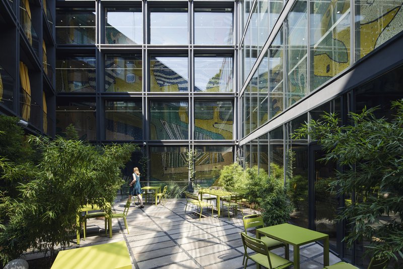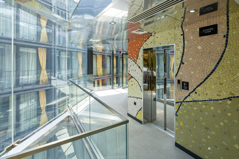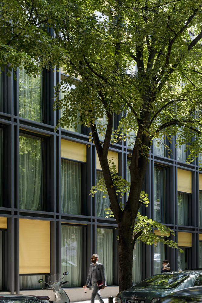 The façade composition utilizes a mix of glass, stone, and patterned elements, allowing the hotel to simultaneously feel modern and rooted in place. Light filters through carefully curated openings, creating a dialogue between indoor spaces and the bustling city beyond.