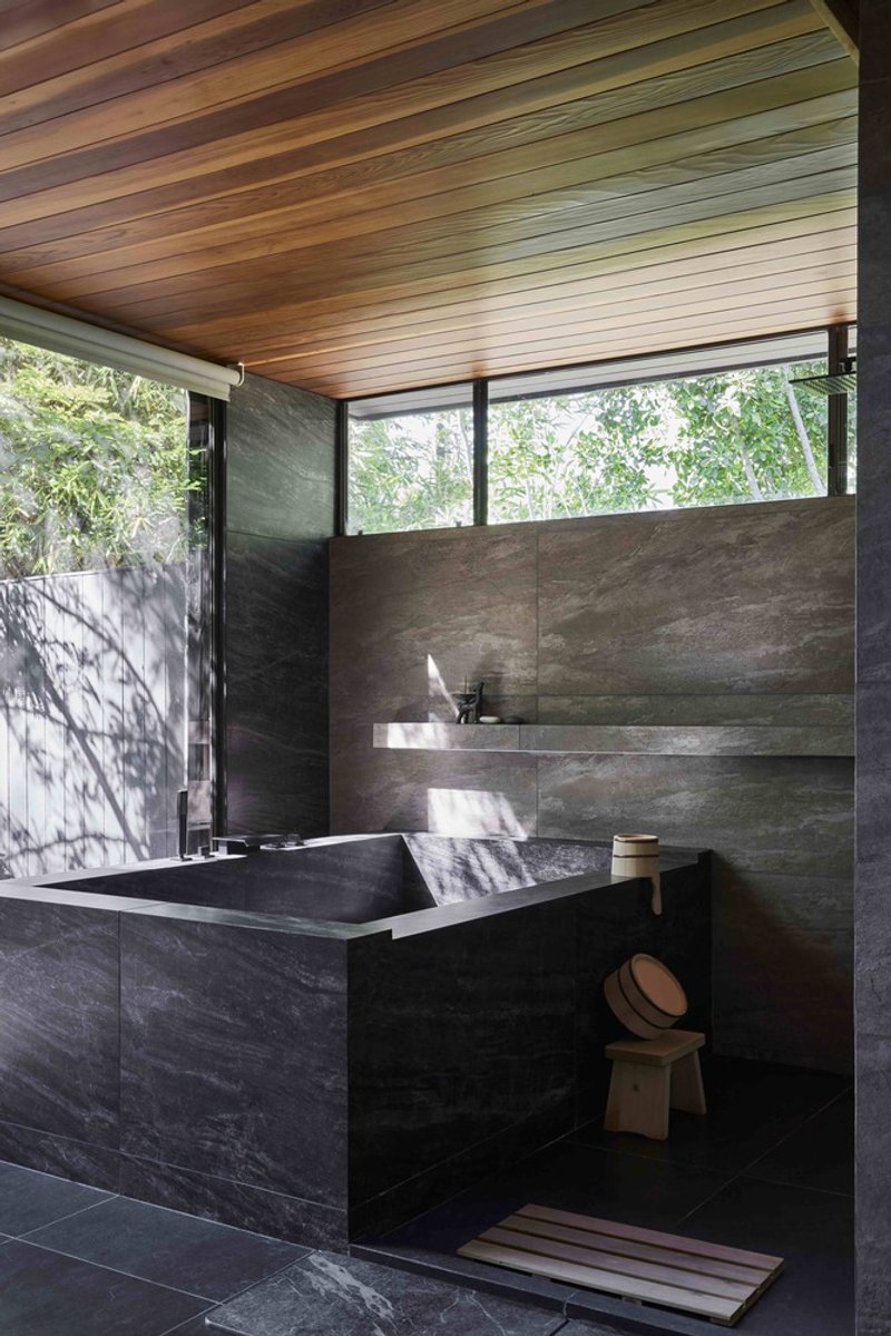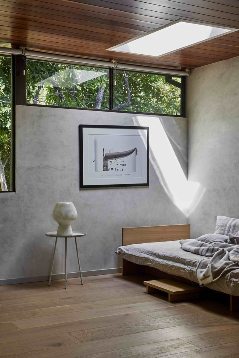 - The primary bedroom features a custom black tatami-lined bed frame, adding texture, sophistication, and cultural reference within a minimalist context.