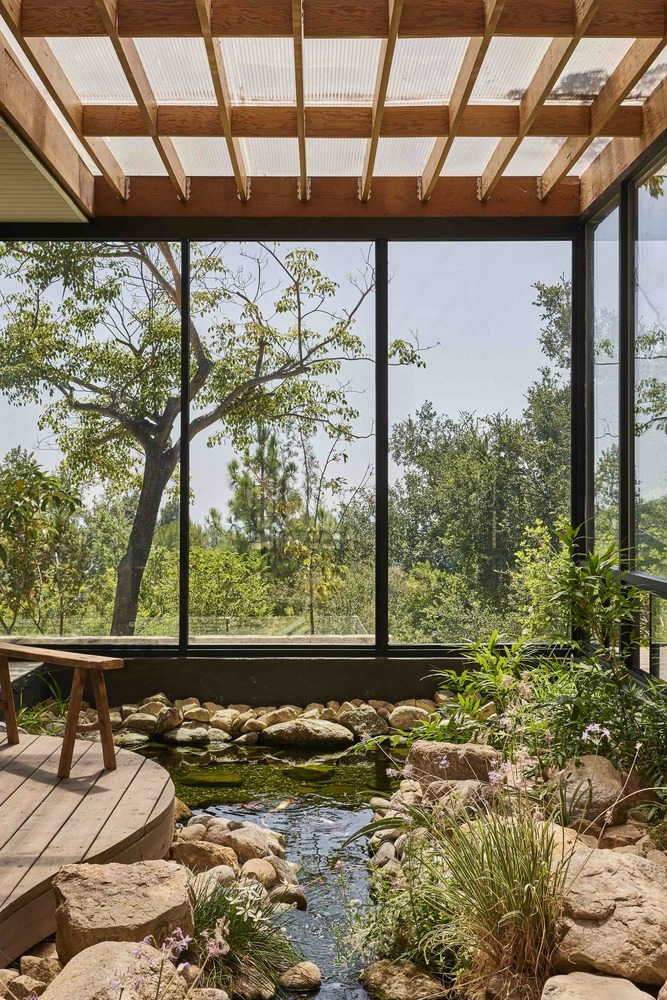 A serene modernist home blending Japanese craftsmanship, Californian landscape, water features, and multicultural design to create a peaceful, nature-connected architectural sanctuary.