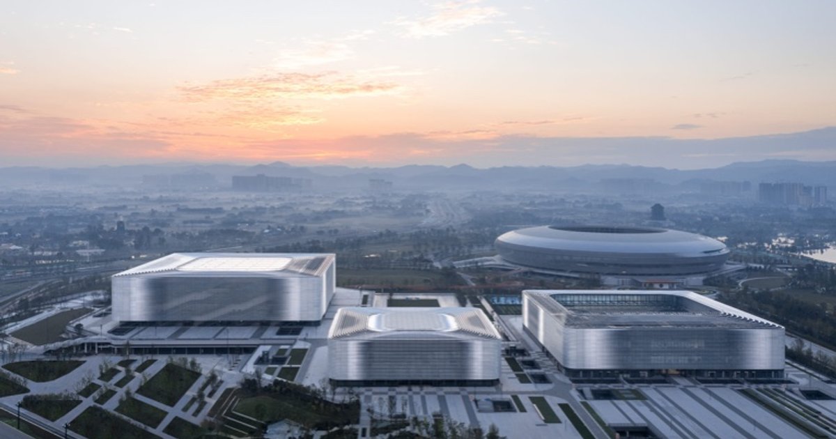 Architects GMP Architekten - von Gerkan, Marg and Partners have completed the Dong'an Lake Sports Park, an ensemble of three new sports and leisure buildings in Chengdu, China. The architects won the competition to design the park in 2018, and it will now be the venue for the coming FISU World University Games.