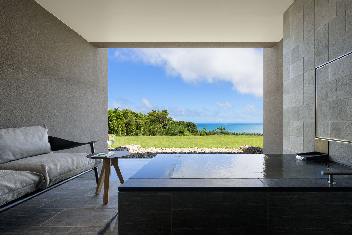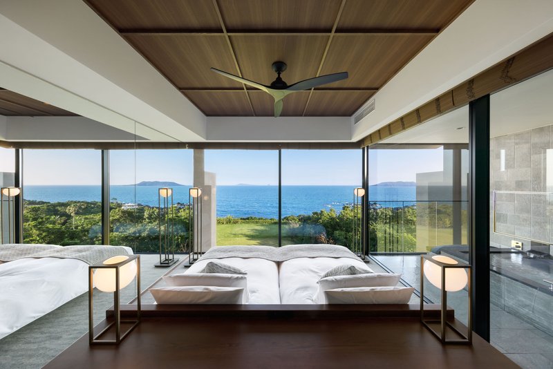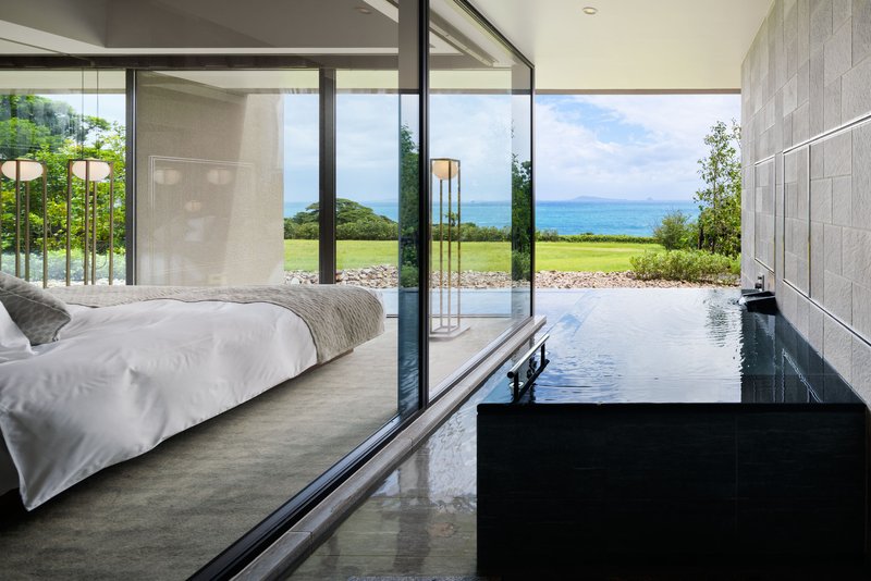 The guest rooms are designed for ultimate comfort, featuring wide-span sash windows (7.4 meters wide) that allow guests to enjoy unobstructed views of the sea. The open-air bathtub on the terrace provides an intimate experience, allowing guests to immerse themselves in the surrounding landscape. Additionally, mirrors placed strategically near the windows reflect the outdoor scenery, blending the interior and exterior spaces seamlessly.