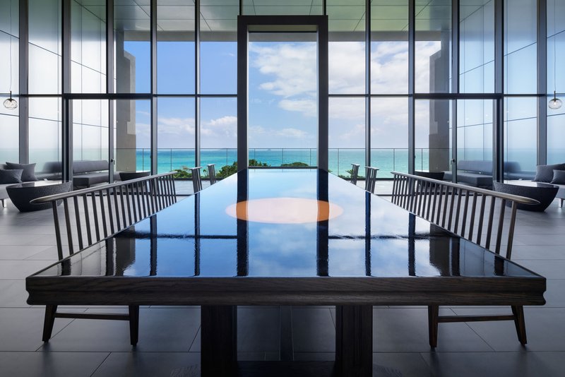 the hotel, the interior design continues to reflect the connection between architecture and nature. The lobby is a masterpiece of design, with expansive aluminum paneling on the walls and ceiling, allowing the horizon and landscape to merge with the interior. A central resin table, designed to mimic a water basin, further reinforces the theme of natural serenity, with the table reflecting the clouds and blue skies above.