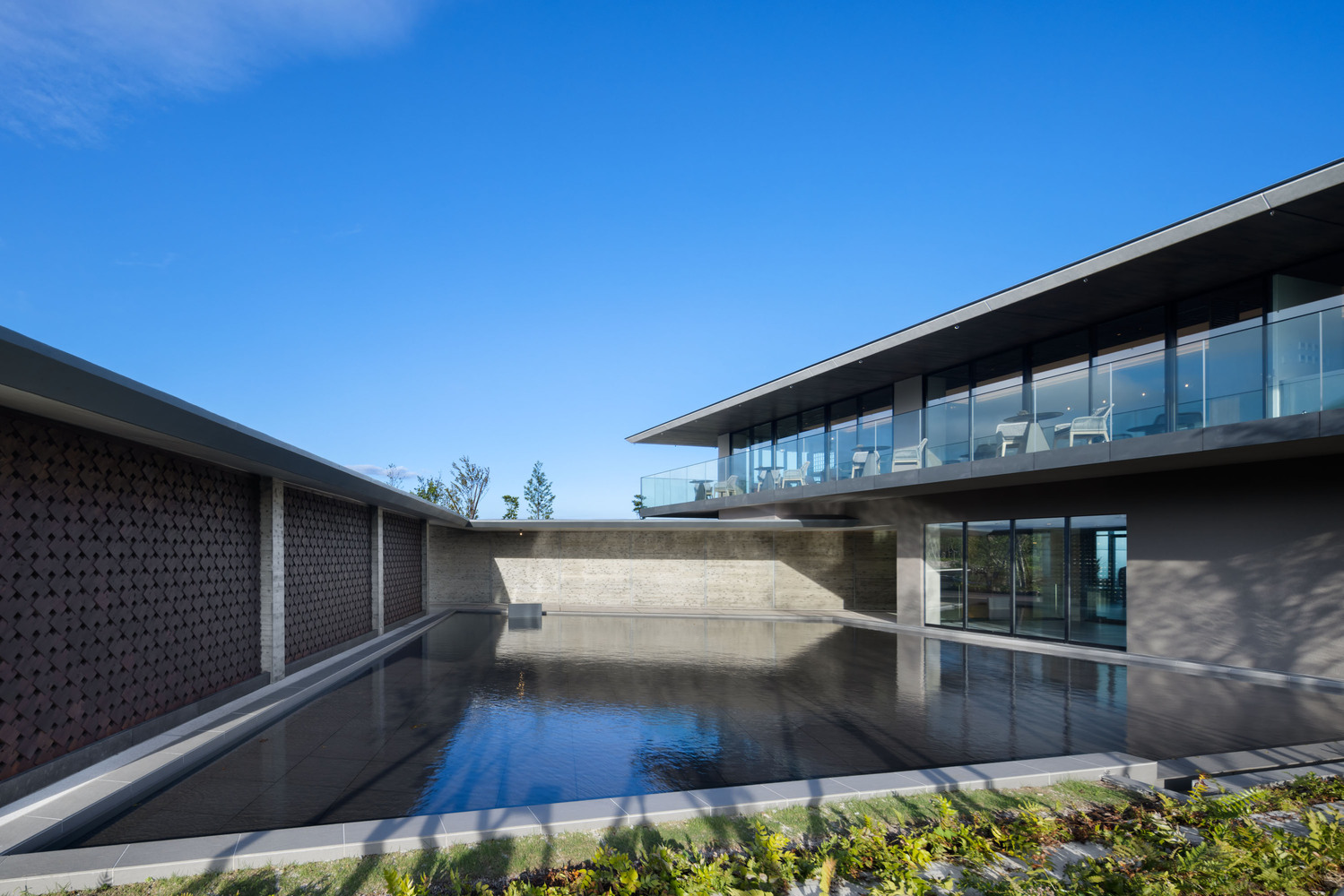 The hotel is designed with a strong awareness of the local landscape, which is characterized by its lava rock formations, lush native vegetation, and panoramic vistas. The long approach to the hotel, lined with vibrant native plants, leads guests through a gateway formed by an as-cast concrete canopy with a cedar board finish. This canopy, along with the surrounding architecture, brings to mind the region's iconic building traditions, such as thick wall columns, arch windows, and slit windows resembling bay windows.