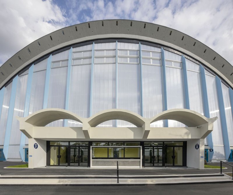 Historic modernist sports hall renovated into an Olympic-ready, energy-efficient cultural venue, preserving parabolic concrete arches, translucent facade, and community legacy.