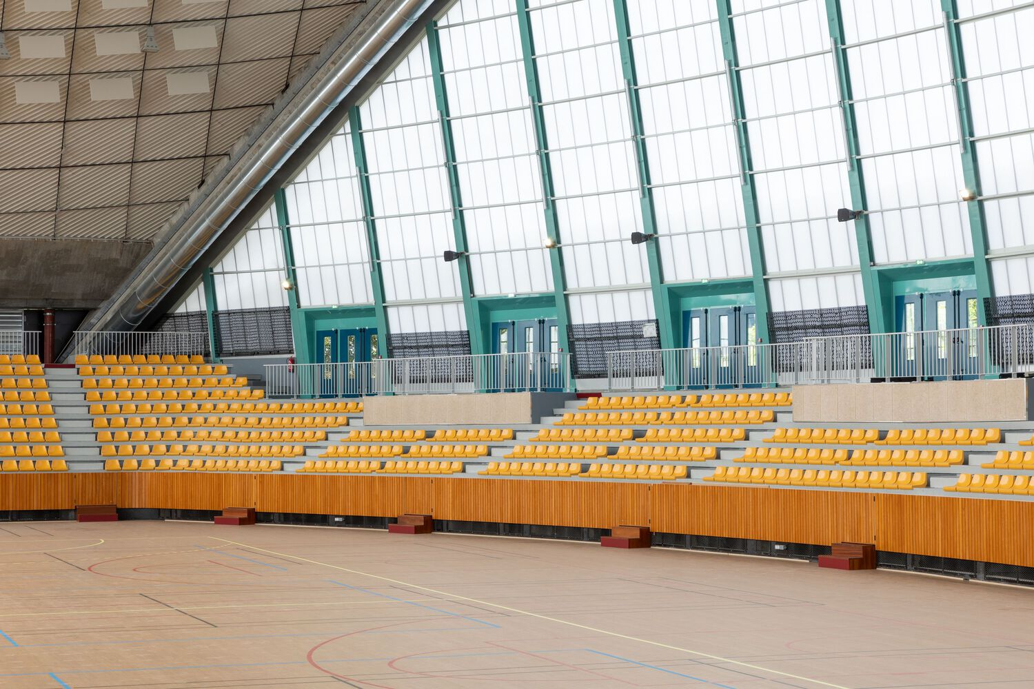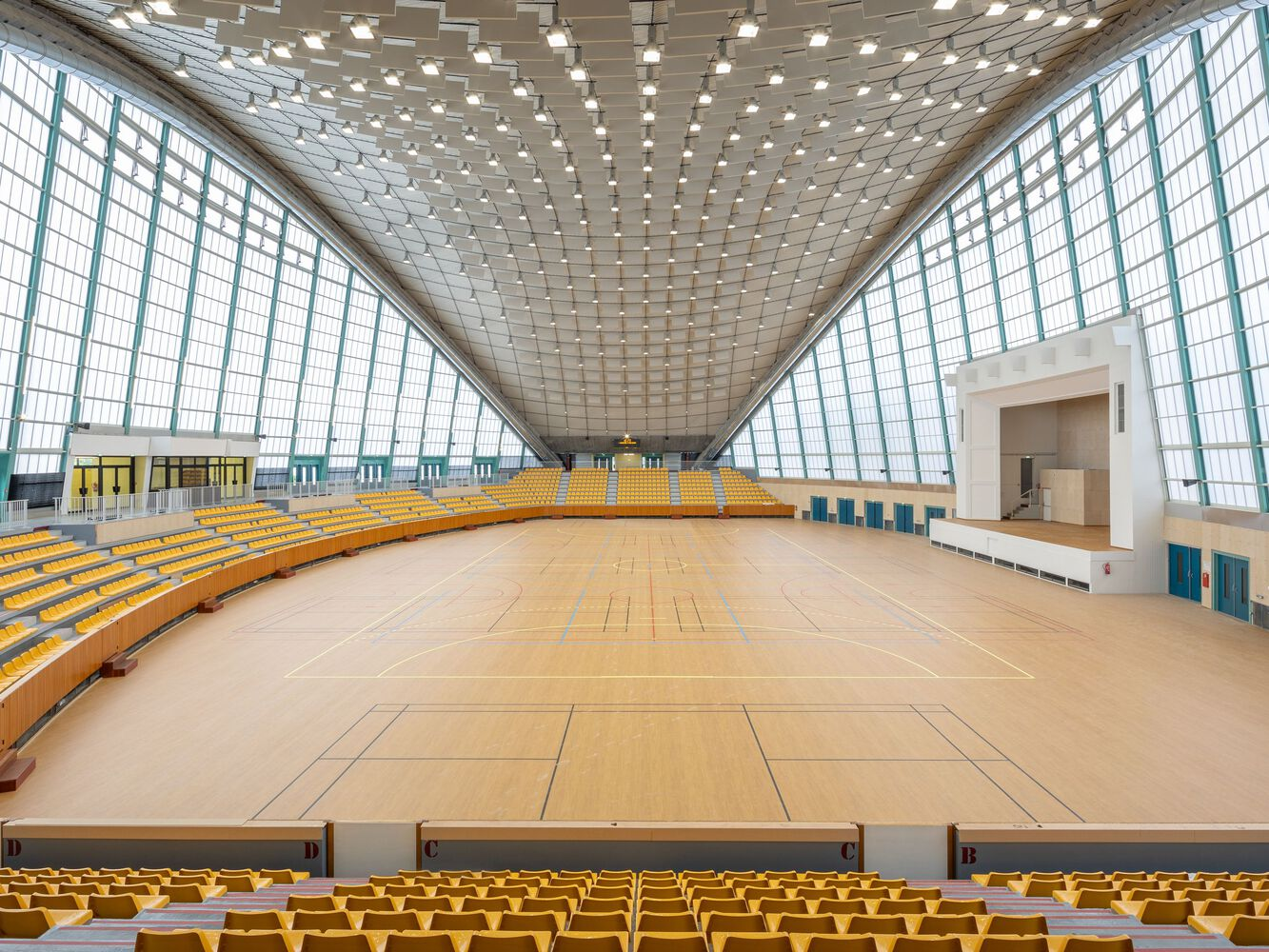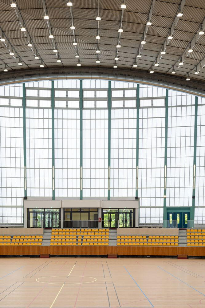 The roof was retrofitted with a new synthetic membrane, enhancing insulation, acoustic comfort, and thermal stability. Internally, the architects introduced acoustic wood paneling, a state-of-the-art sports floor, and high-efficiency LED lighting, replacing the original fixtures while respecting their spatial rhythm. New seating in a bold yellow hue references the color palette of the building’s original interior, reinforcing continuity between past and present.